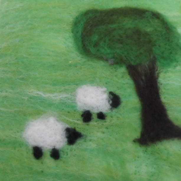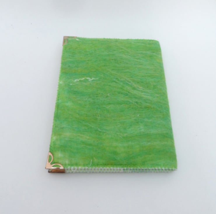 This listing is for an A6 size removable notebook cover and associated notebook. The outer cover has been hand felted using a blend of green shades of merino wool and bleached tussah silk. Two white woolly sheep grazing under a tree have been needle felted to the front cover. Inside white commercial felt has been used. The cover has been stiffened using medium weight interfacing enabling it to hold its shape well. Gold coloured corner protectors have been added for extra durability.
