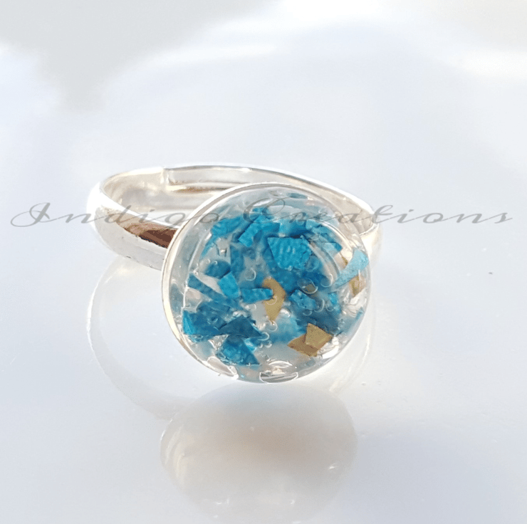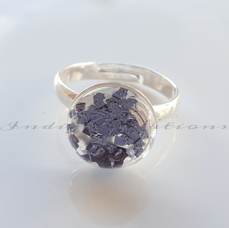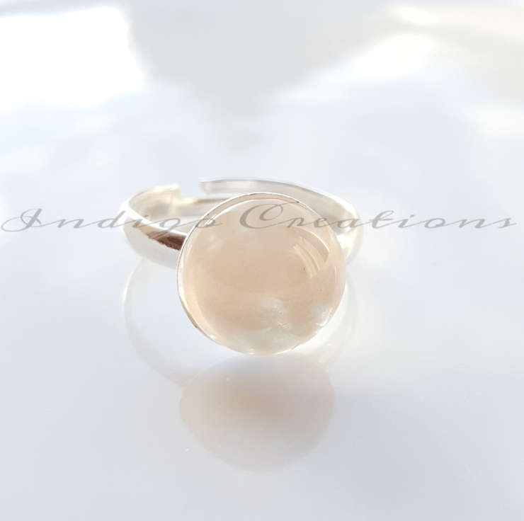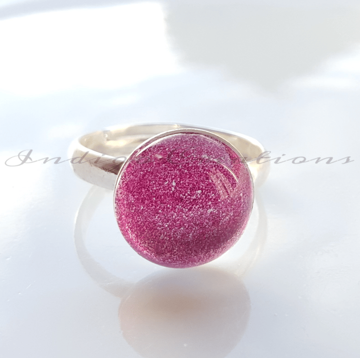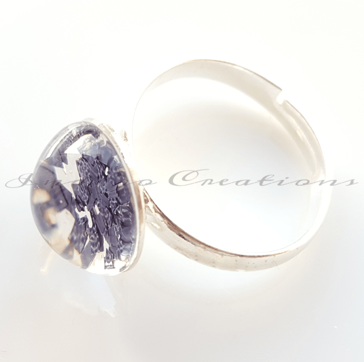 This fun adjustable ring has a 20mm glass cabochon in the middle which has been painted with nail varnish on the back. The cabochon has been attached to silver plated adjustable ring base with E6000 glue. Suitable for any occasion and would make a great gift for a friend. Available in in four different colours: Black, Turquoise, Purple And Pearl Pink.