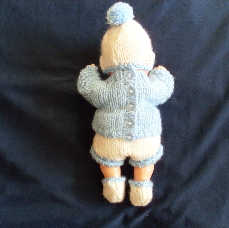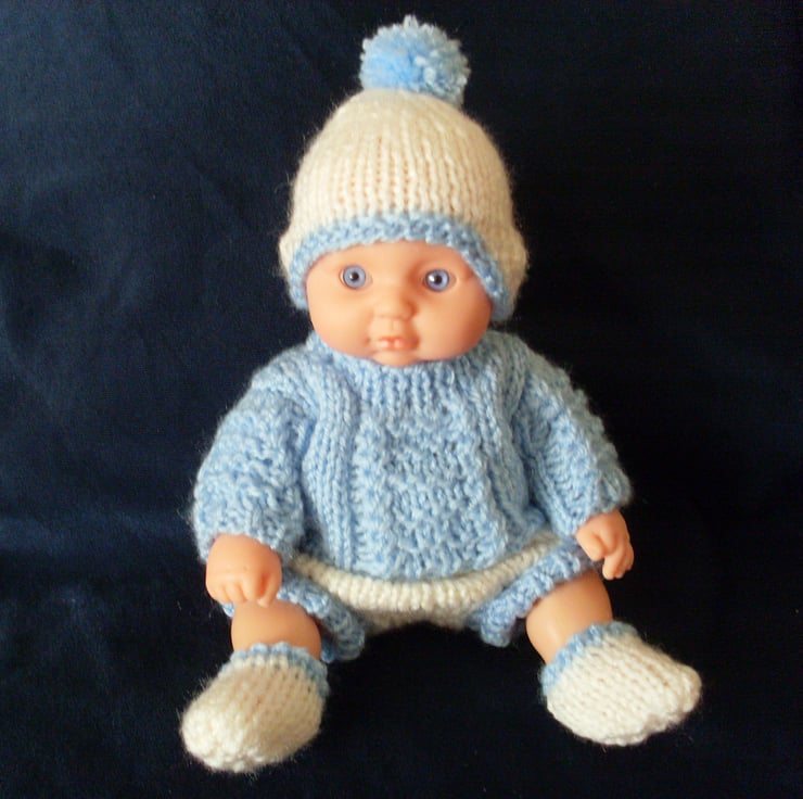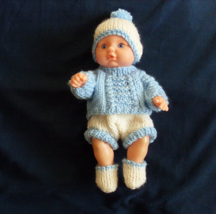Dressed in Cream & Light Blue Trousers, Light Blue Jumper with button fastening,Cream & Light Blue Pull on Hat & Cream Socks