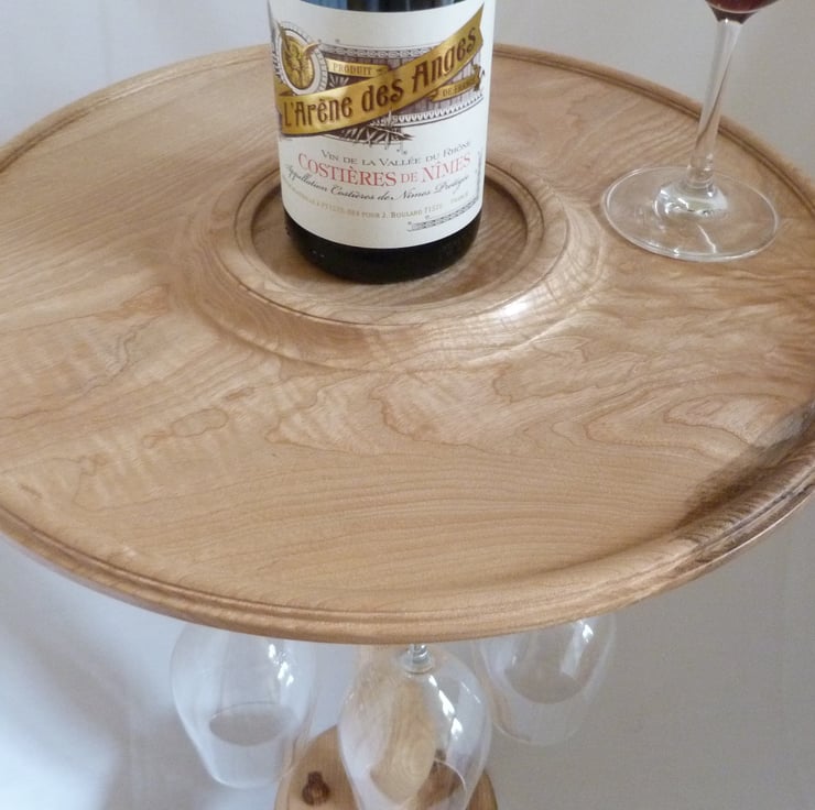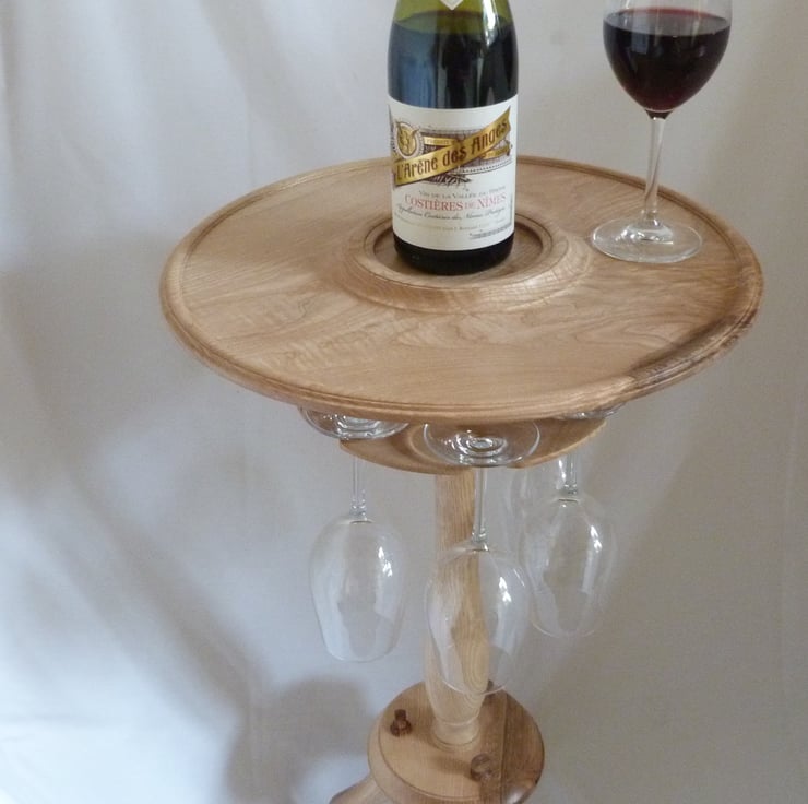 A NEW IDEA WITH NO SCREWS , NAILS OR PLASTIC PIECES, THE TABLE IS MADE OF ASH THROUGHOUT. THREADS ARE CUT OR TAPPED DIRECTLY TO THE WOOD. THE PIECE CAN BE EASILY PUT TOGETHER BY HAND IN 3-5 MINUTES ,IDEAL FOR STORAGE OR TRANSIT. THE INTEGRAL WINE GLASS RACK HOLDS SIX GLASSES. THE TOP DIAMETER IS JUST 15-1/2'', TOTAL HEIGHT 26'' , FINISHED WITH BEES WAX AND CARNUABA WAX TO THE TOP SURFACE. OTHER WOODS AVAILABLE.