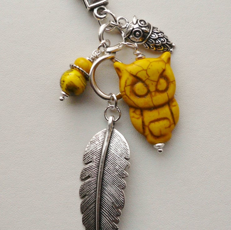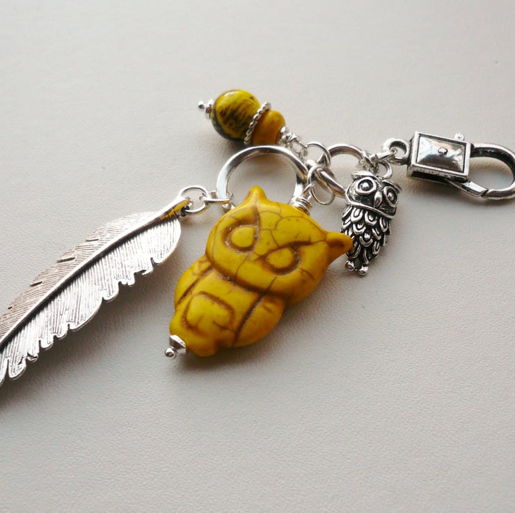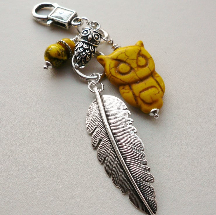 This attractive owl feather themed handbag charm is made up of a 30mm long yellow Howlite owl shaped bead teamed with matching 8mm oval rondelle yellow Howlite bead with 10mm round printed yellow acrylic bead .Also includes 23mm long Tibetan silver owl charm and finished off with a 5cm long Tibetan silver feather pendant hanging below. All attached to a Tibetan silver connector and 25mm trigger clasp.