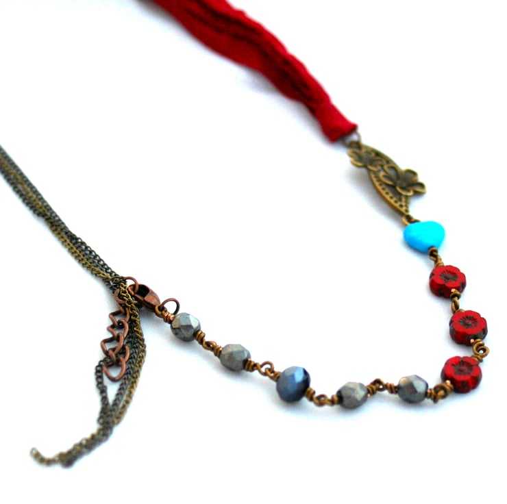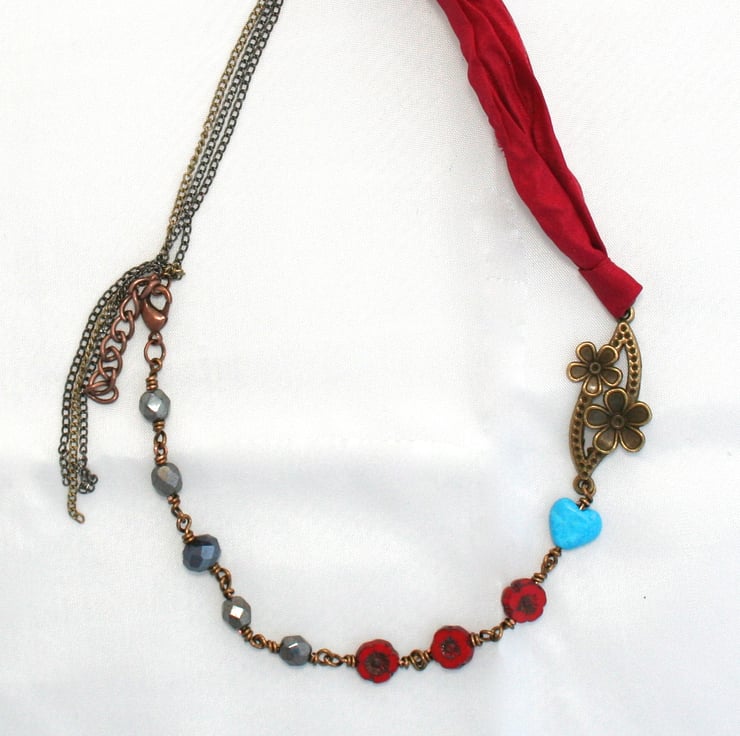 Czech glass crystals in a gunmetal colour with bright red flower beads and a blue magnesite heart are rosary linked together with an antique copper flower connector and joined with bright red recycled sari ribbon and three layers of fine gunmetal and antique copper chain.