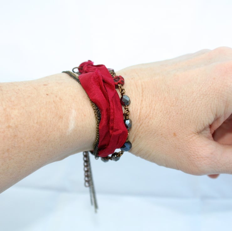 Black and red is one of my favourite colour combinations and the blue magnesite heart is a perfect striking contrast. The sari ribbon gives an extra layer of texture.