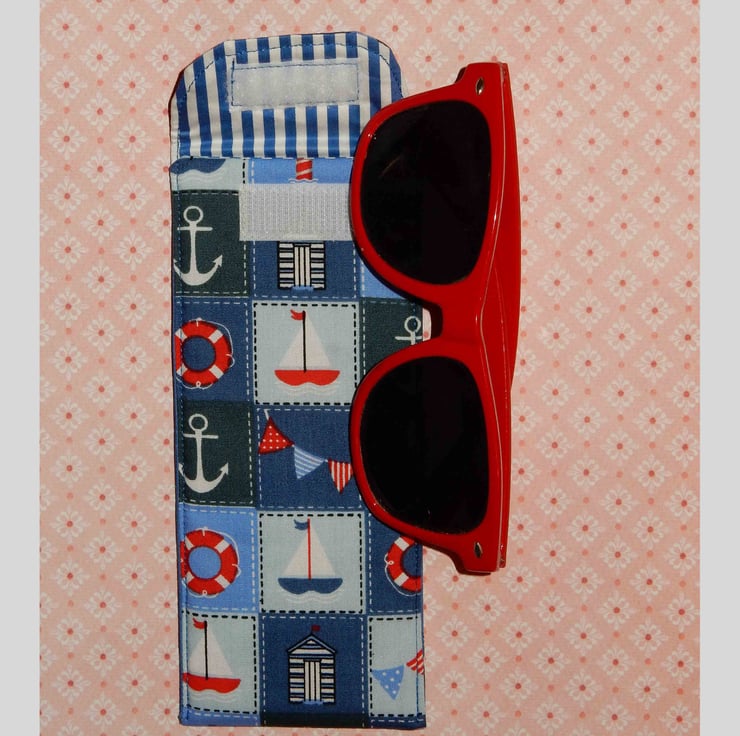 A handy case for your glasses or sunglasses.This is made from a cotton print fabric featuring boats, beach huts, bunting and other nautical items, with a smart striped lining. It also has a layer of wadding for protection. The case fastens with velcro.