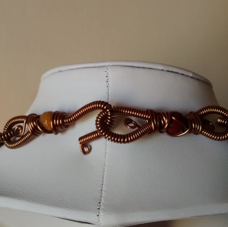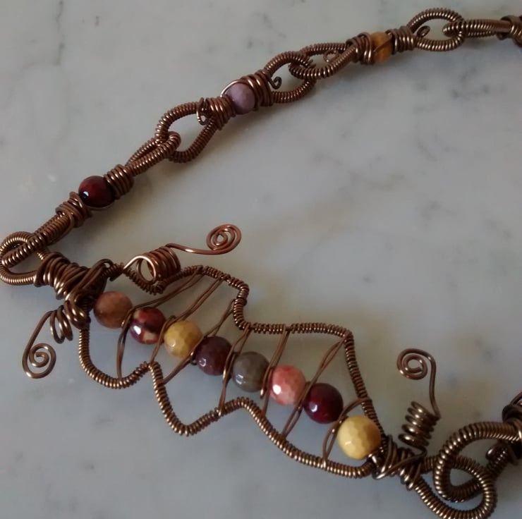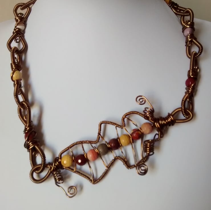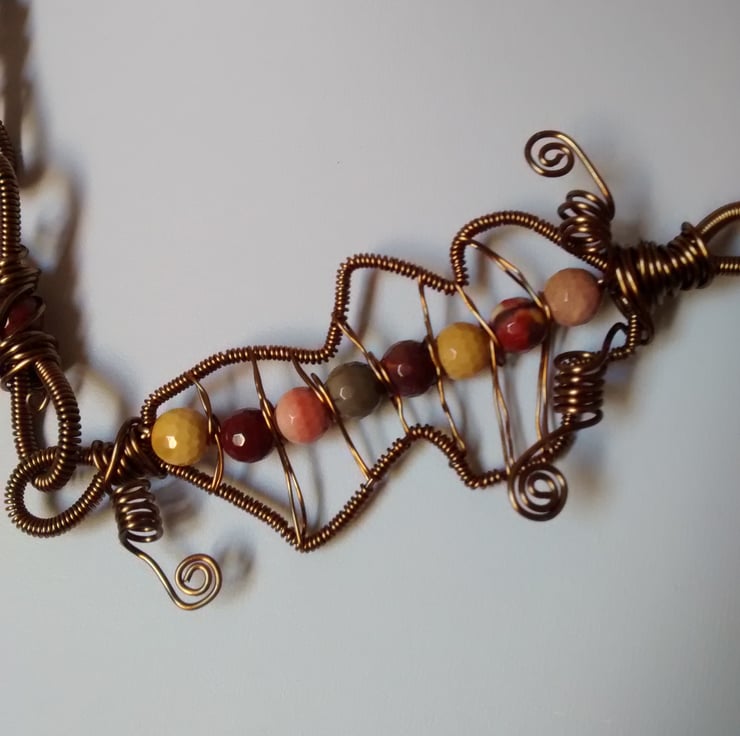 Lots of wire work Anique Bronze and lovely mookite gem stones make up this necklace.