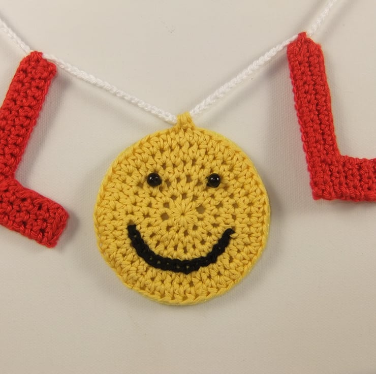 The letters and smiley face are crocheted in cotton and hand-stitched to a felt backing for extra stability. The letters are approximately 7 cm tall and the string is 62 cm long excluding beads.