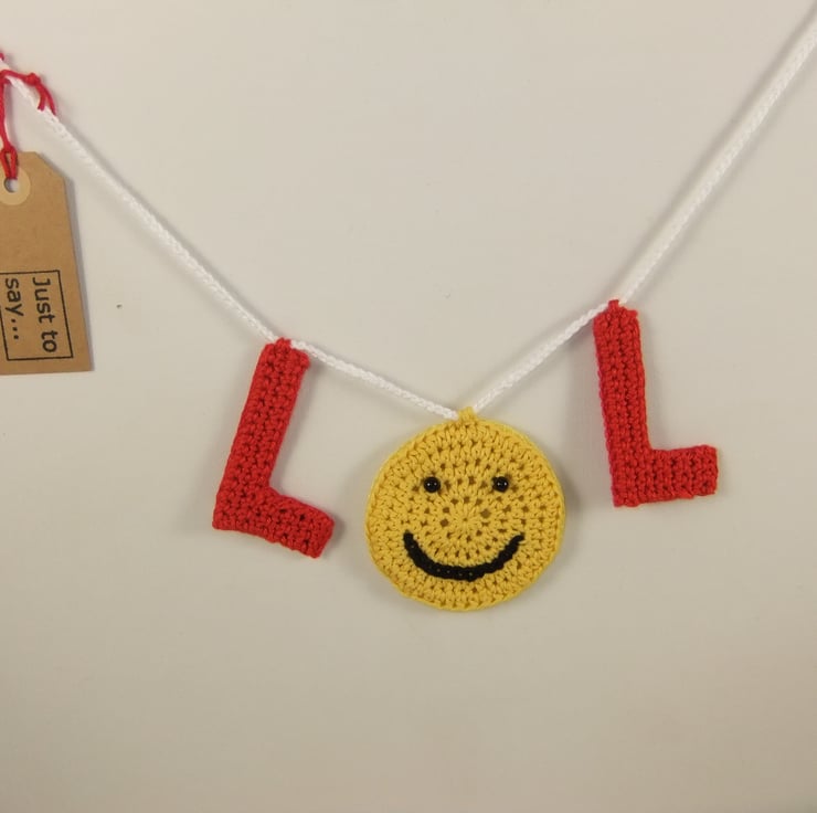 The smiley face has glass beads for eyes. The crocheted 'string' allows you to tie your decoration and it is finished off each end with a wooden bead. The decoration comes complete with a 'Just to say ...' tag for you to add a message if you wish to send it to someone as a greeting or you could just allow the letters to speak for themselves!