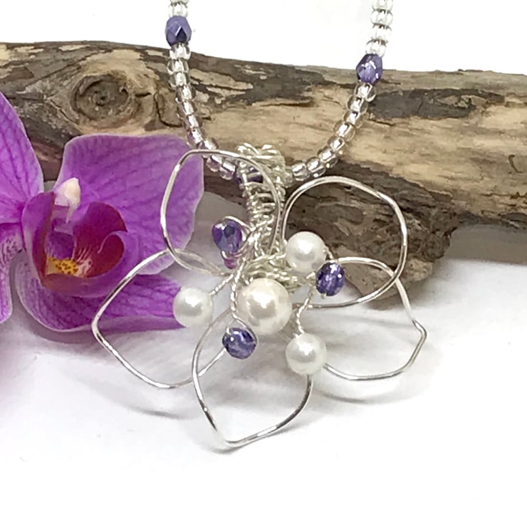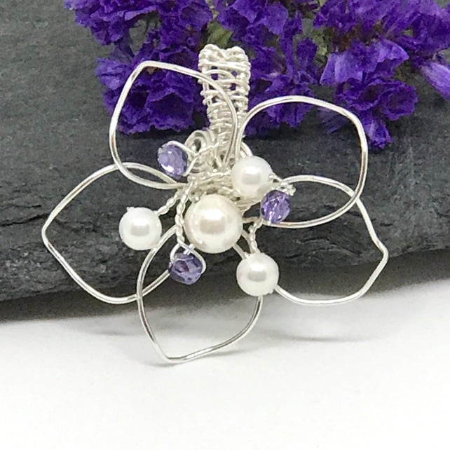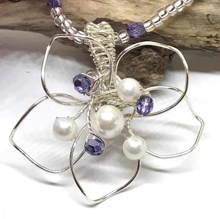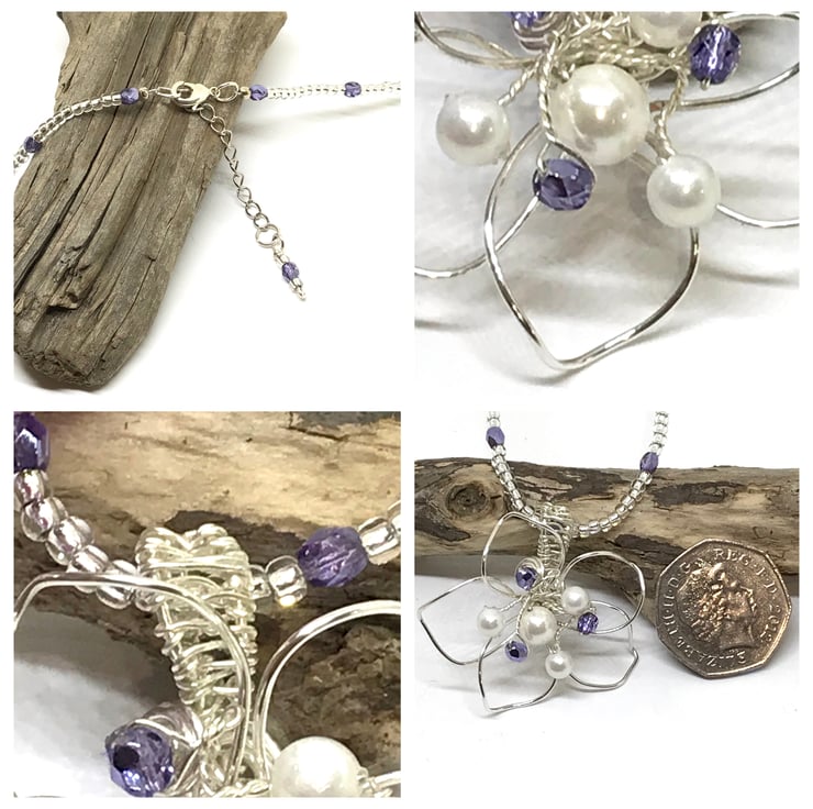 I have created this flower pendant necklace with silver plated wire using wirewrapping and wire weaving techniques. Classic cream shell pearls and purple Czech crystal beads have been twisted on fine silver plated wire to create the stamens. The pendant is complemented with a necklace made with Czech purple crystal beads and silver lined seed beads, finished with a silver plated lobster catch and extender chain. The pendant looks pretty on this necklace but can easily be removed and worn on a silver chain, neck wire or cord of a your own.