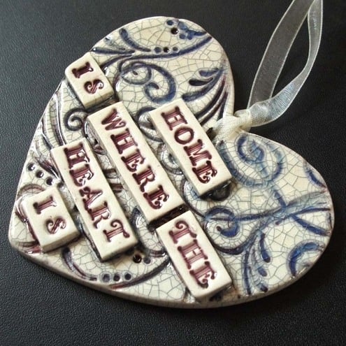 This ceramic heart is made from white earthenware clay and decorated with the words "Home is where the heart is"