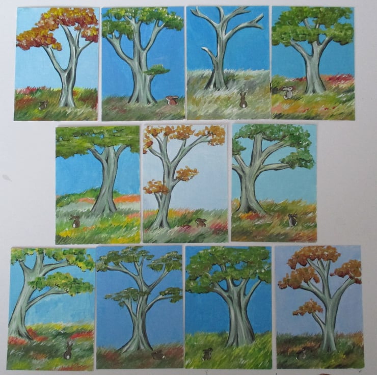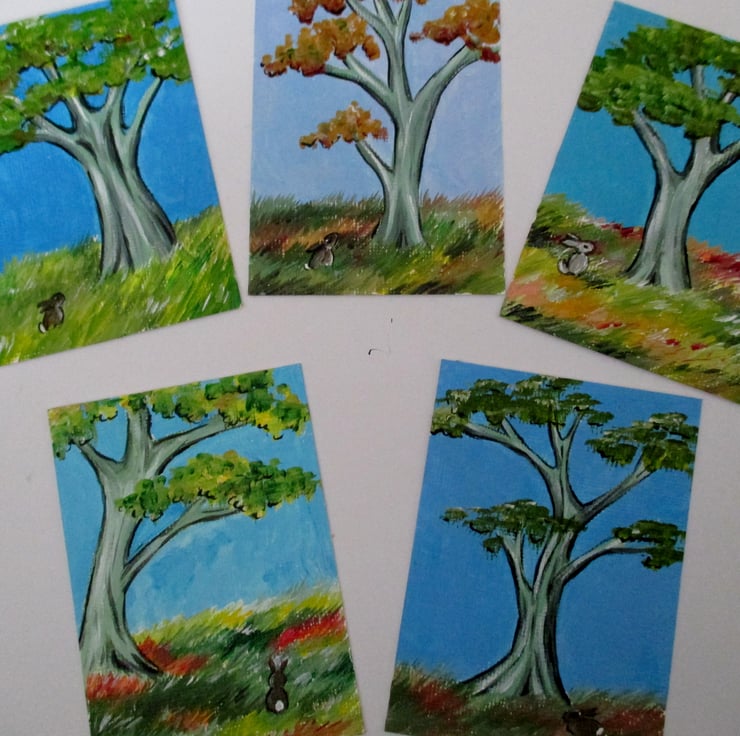 This is an original acrylic painting of a tree with a tiny wee bunny rabbit sitting below it.