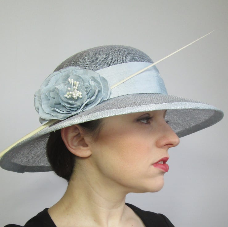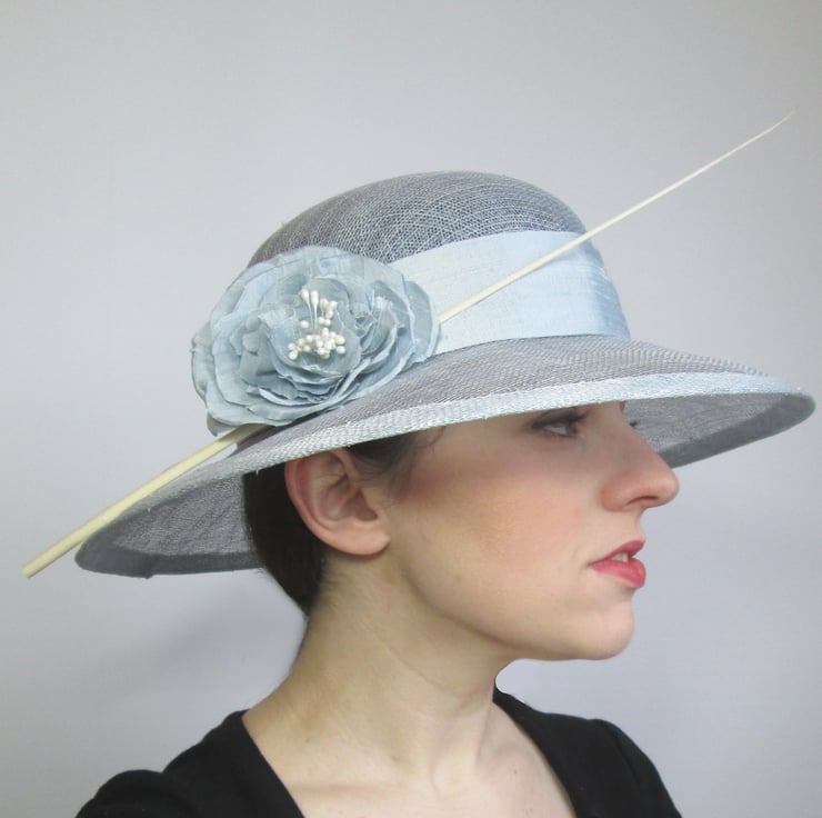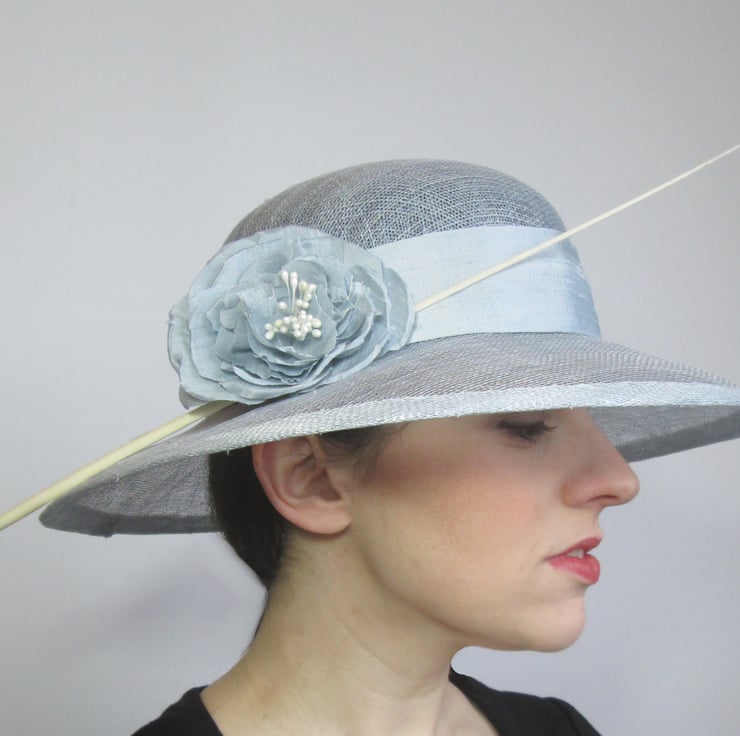 Beautiful ladies occasion hat in pale blue. Handmade in sinamay fabric using traditional millinery techniques, the hat has been trimmed with a pure silk dupion fabric band and handmade silk peony bloom in ice blue. Perfect for Royal Ascot, weddings or formal meets, the hat can be tailored to your outfit on request.