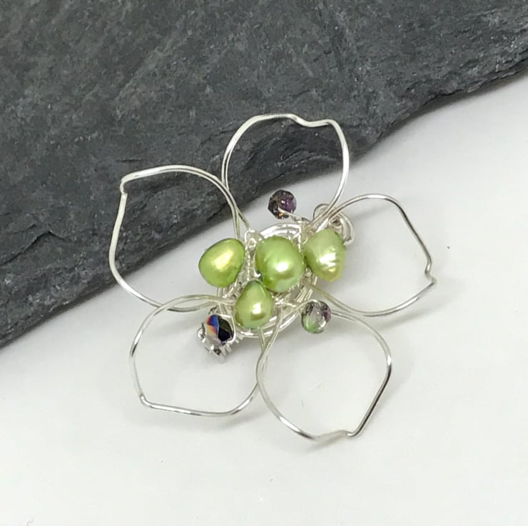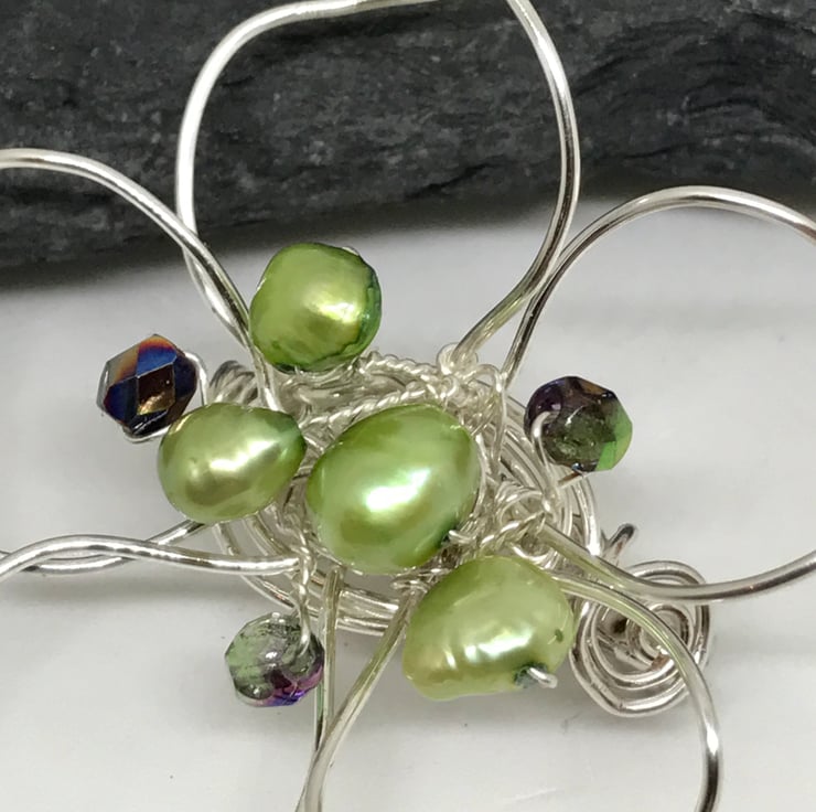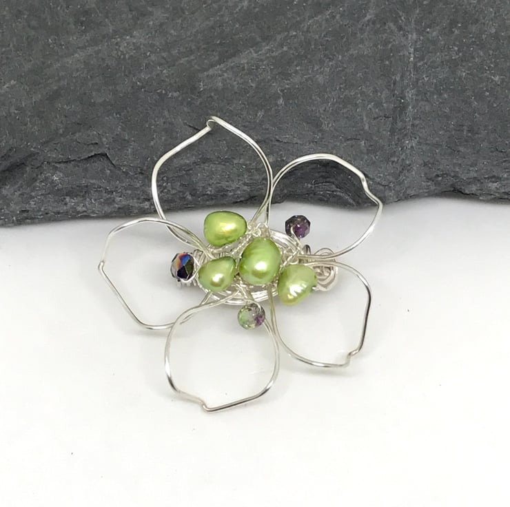 A pretty silver plated brooch with green freshwater pearls and Czech fire polished crystals in magic orchard. These beautiful iridescent crystal beads are green with hints of purple. I have used wirewrapping techniques to created this brooch by forming silver plated wire into a flower shape and twisting beads on fine silver plated wire to create the stamens.