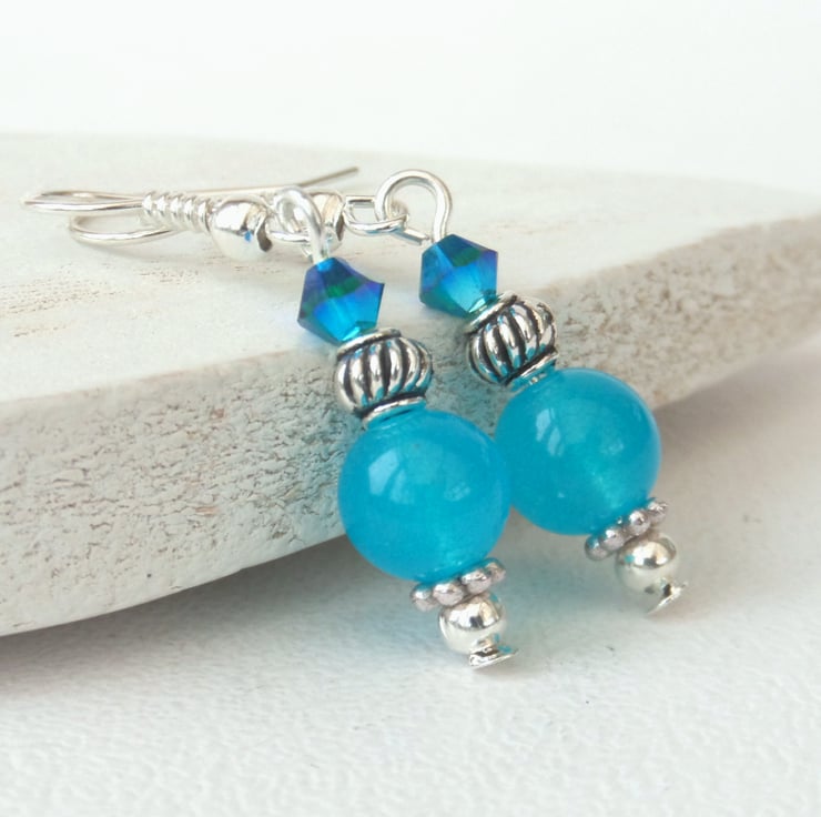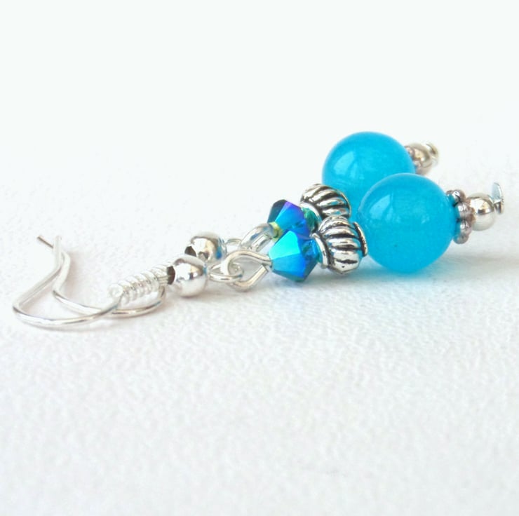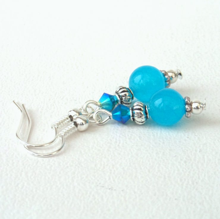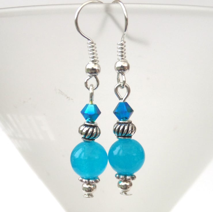 A lovely shade of dyed blue jade hangs from silver plated wires with stunning Swarovski® crystals.