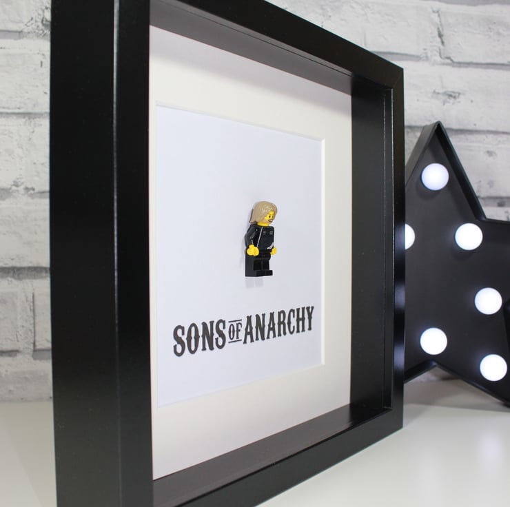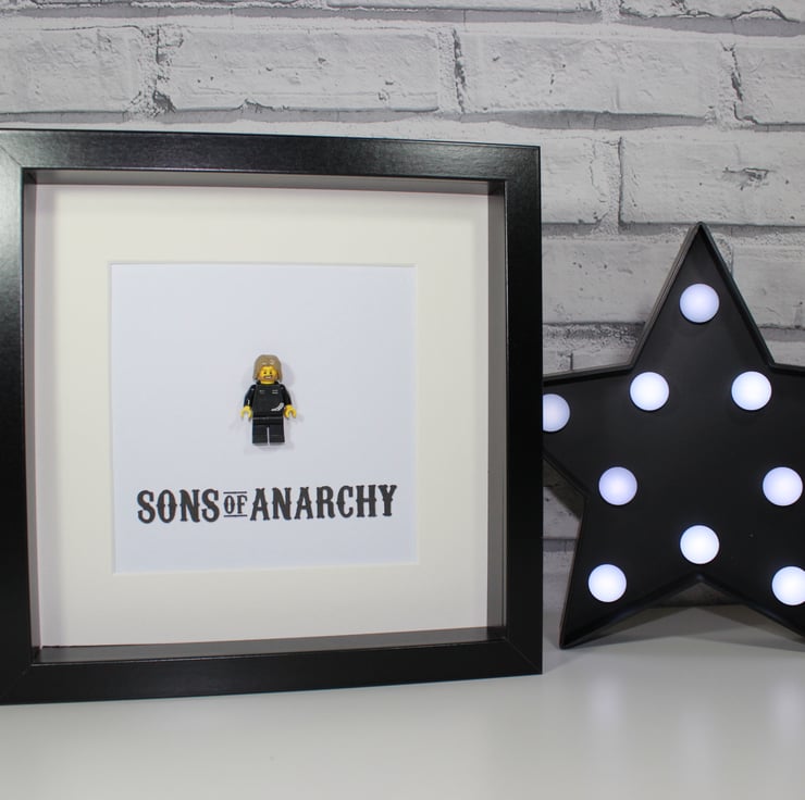 Our little biker guy has been mounted in a deep box frame and underneath we have printed "Sons of Anarchy" in a sideshow font similar to that used by the show.