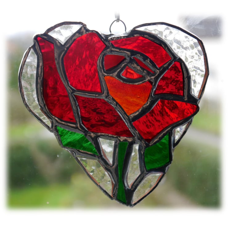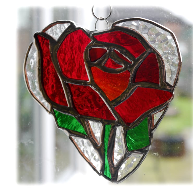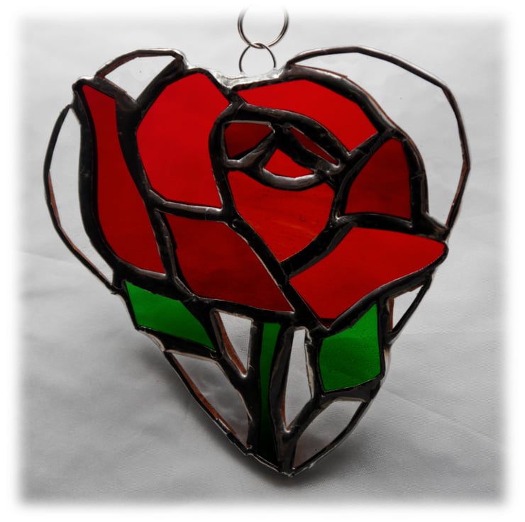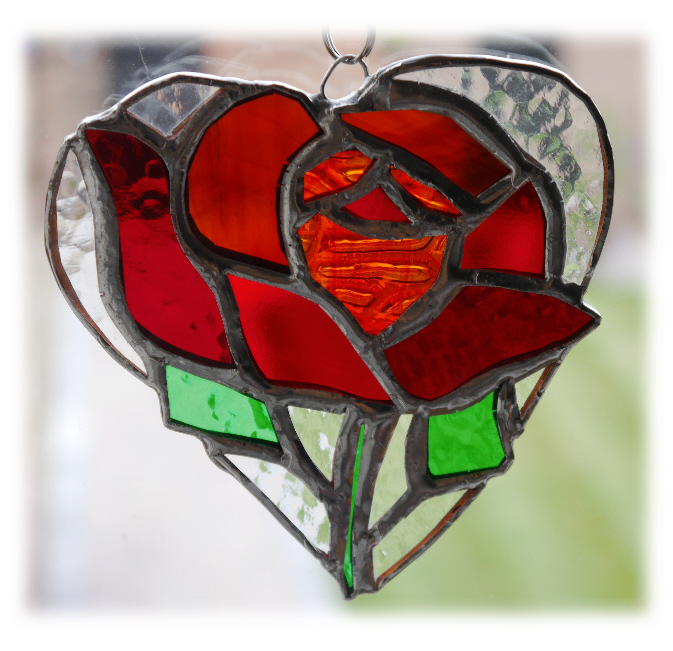 A full bright red rose in a heart, entirely handmade by me to my own Joysofglass design.