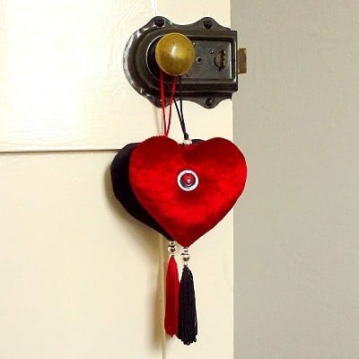 At the base of each velvet heart are three silver-plated beads from which hangs a red or black handmade tassel. The heart is hung by a 9cm (3.5 inch) loop of red or black satin cord knotted at the base with a further silver-plated bead. The loop is big enough for it to hang over door, drawer or dresser handles. The total length of the ornament is 28cm (11 inches).