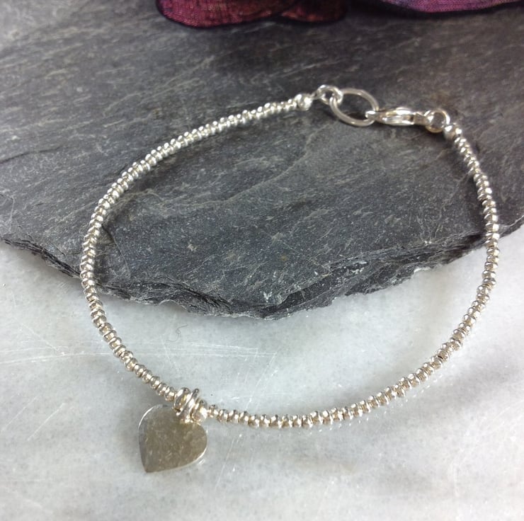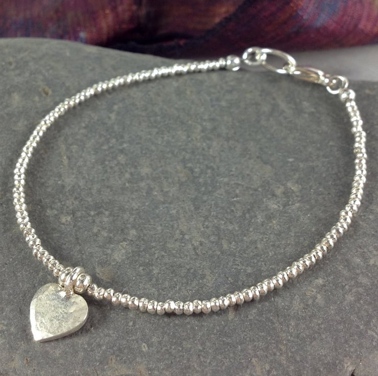 A beaten silver heart charm hangs from a bracelet of solid fine silver seed beads.