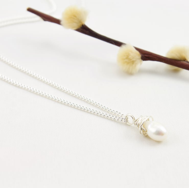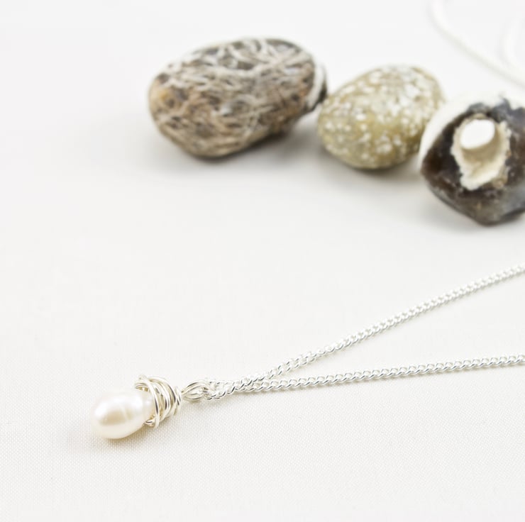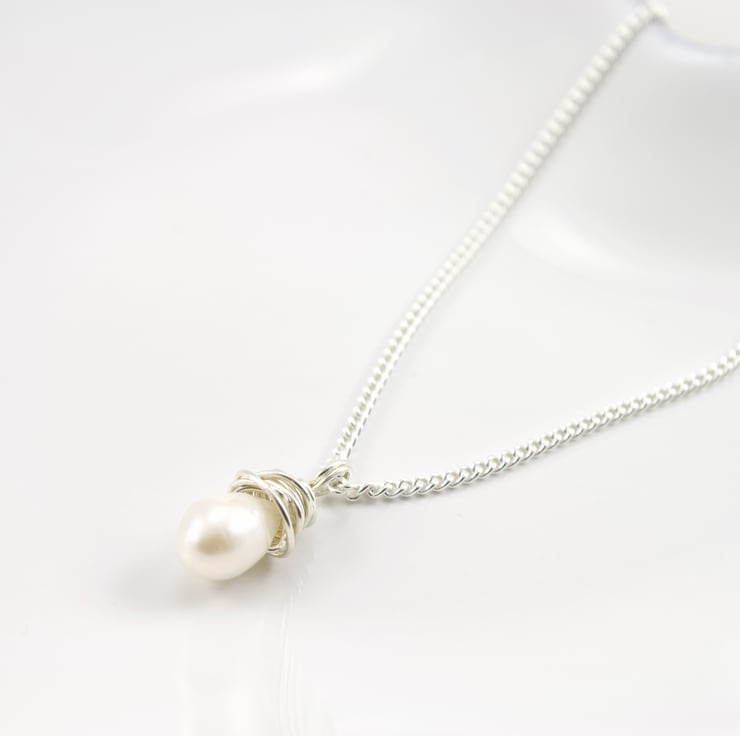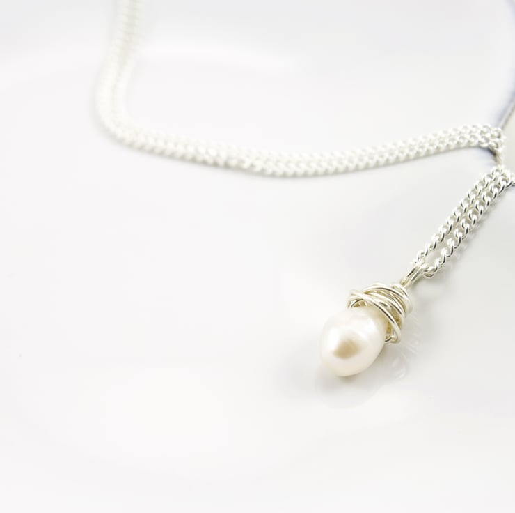 A beautiful white freshwater baroque pearl has been wire wrapped with sterling silver wire to form a dainty pendant which is presented on an 18"/45cm sterling silver curb chain. A timeless classic with a contemporary twist.