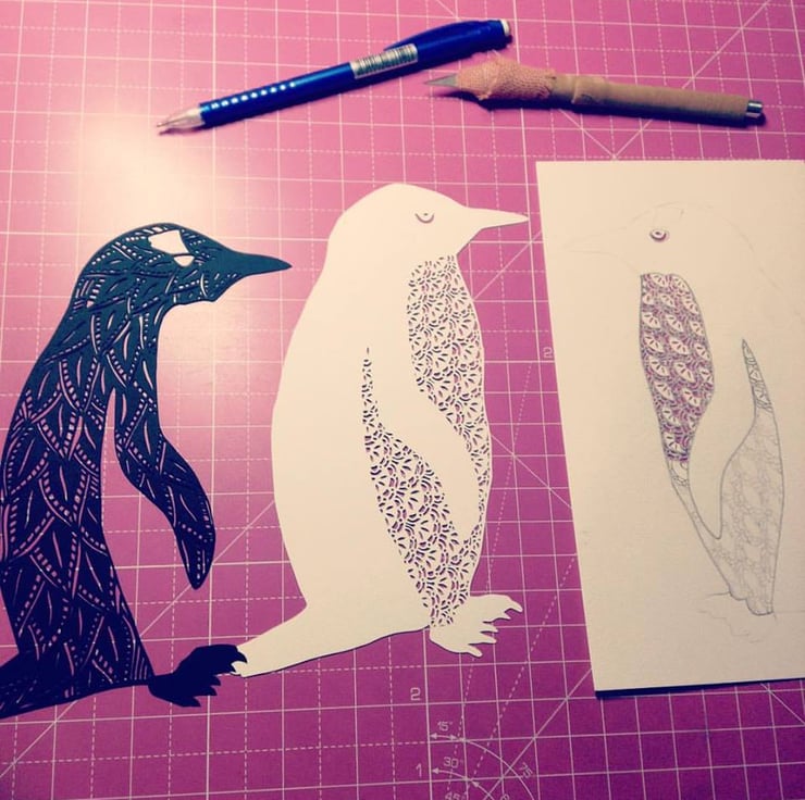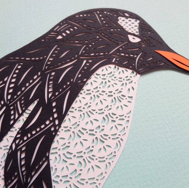 My daughter and I visited the Sealife centre last October and were fascinated watching the little gentoos, especially the leader 'Alf'. This design was inspired by him. We sketched them on the day and I couldn't wait to get home to work on a papercut version of him.