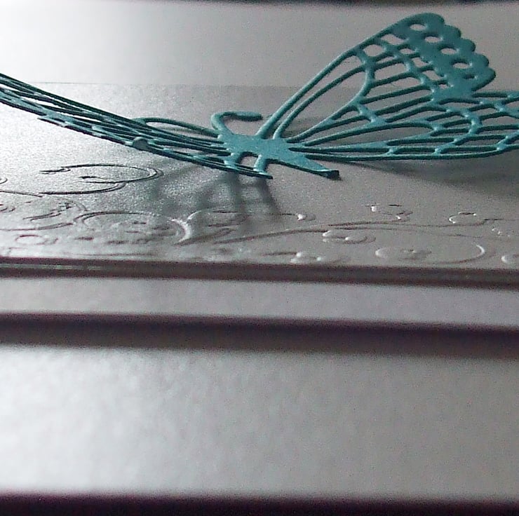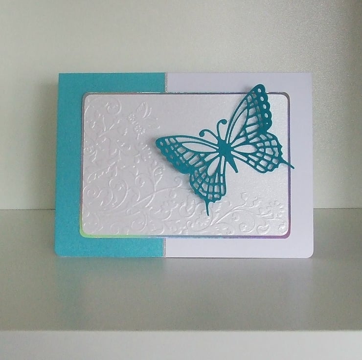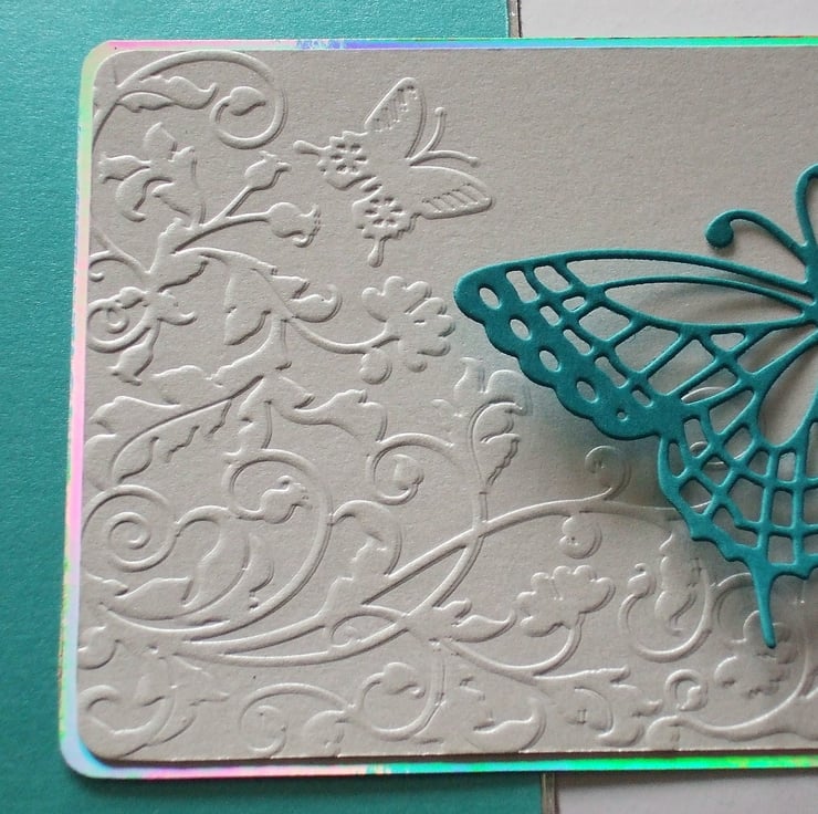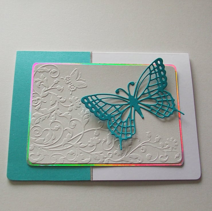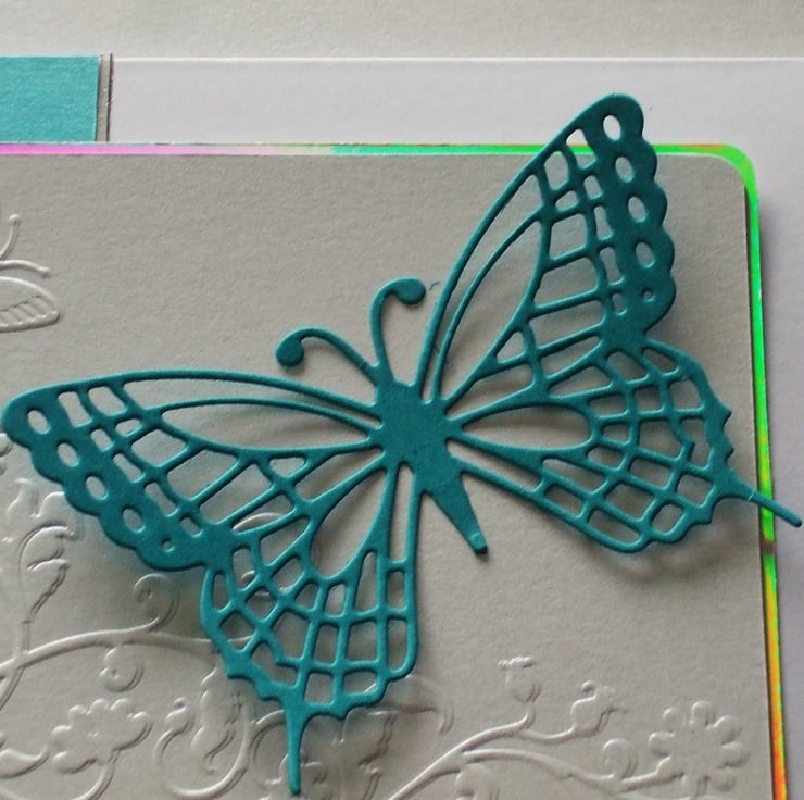 The card front has been partly covered in teal coloured card that has a pearly finish, this has been edged with a narrow glittered border. A layer of pearl card has been embossed with a pattern of swirly foliage, flowers and butterflies it has then been layered onto silver foiled card with a rainbow finish, onto this I've added a large die-cut butterfly in a teal coloured card in a matt finish. The butterfly has been glued on the body only so the wings can be lifted to give depth to the card.