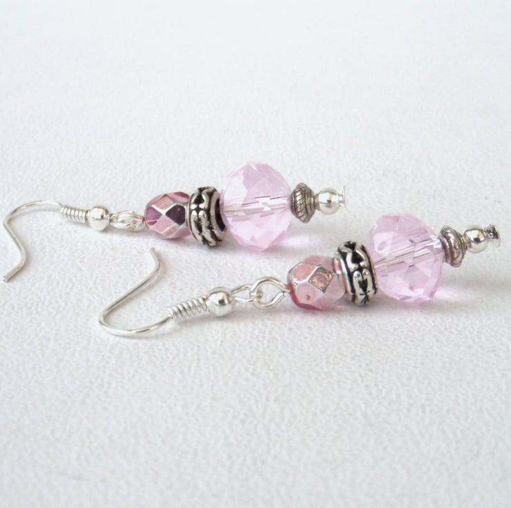 I have used an ornate tibetan silver bead to separate the two crystals and completed the earrings with smaller silver coloured beads.