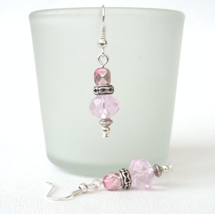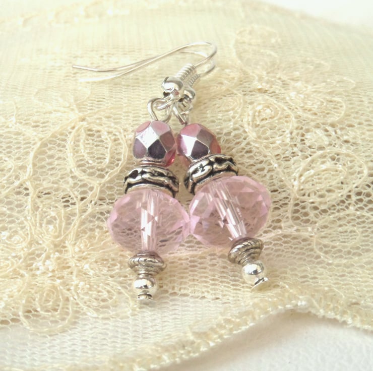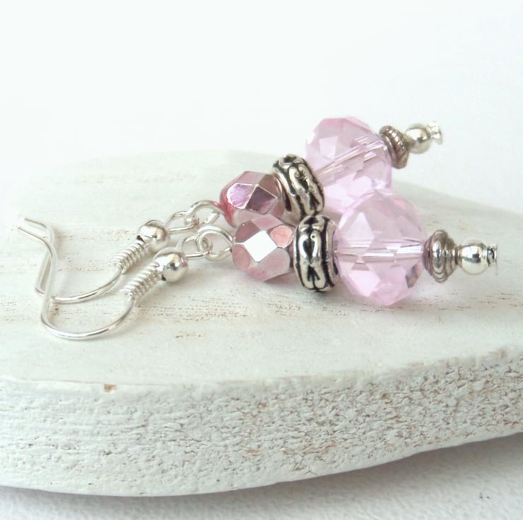 The larger crystal is a delicate pink faceted rondelle shape, measuring 10 x 8 mm and the smaller crystal is slightly darker and is what is known as 'half coated'. This gives a lovely dual effect - half the crystal is coated with a metallic coating and the other half is uncoated, giving it greater depth.
