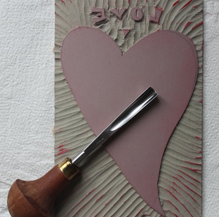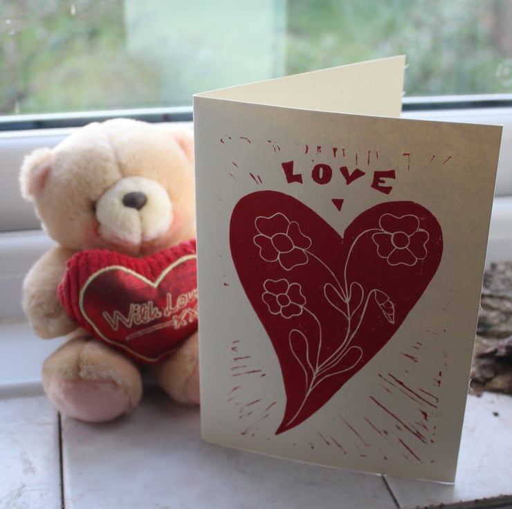 This Valentine's card is from a simple design that I had stuck in my head all day - it's come out pretty much as I saw it. In the item photographs you can see the lino that I used. The card can be used for other occasions too, for weddings or just to tell that special someone how you feel any day of the year!