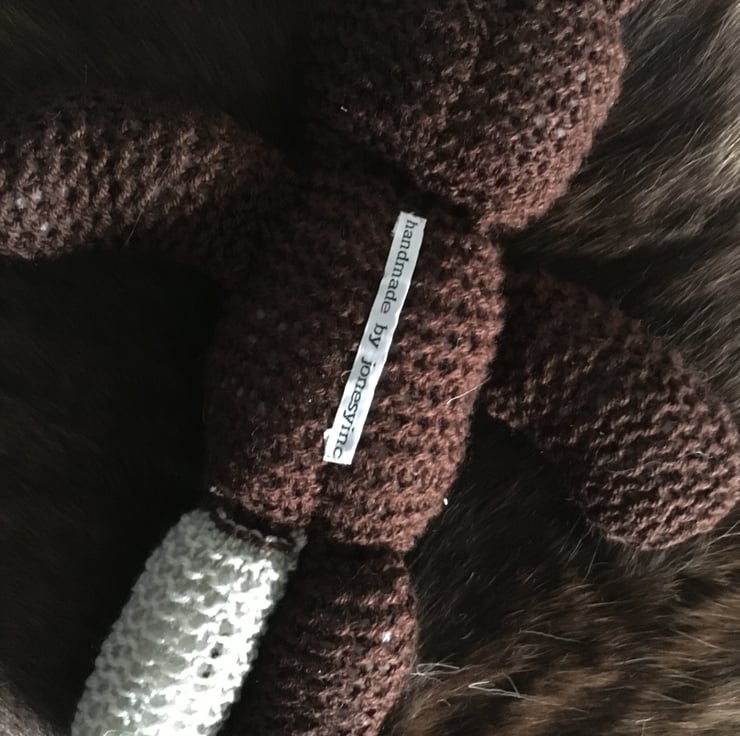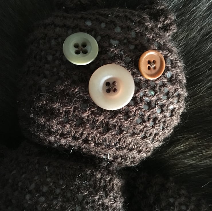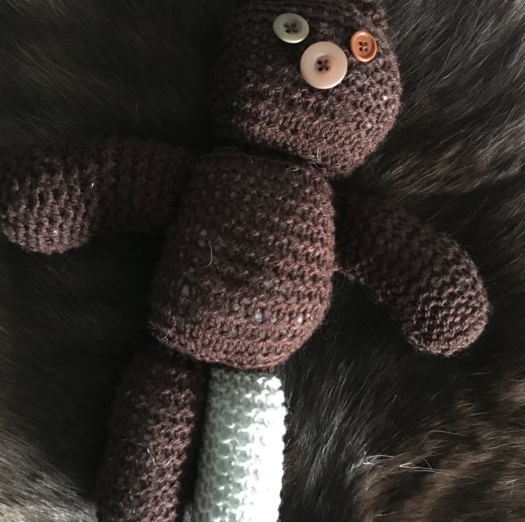 Handknitted teddy bear, made using a variety of yarns including cotton, merino or wool....this will vary so please see the relevant section for details. Filling is 100% polyester. Face comprises vintage buttons. Item is approx 31cms ear to paw