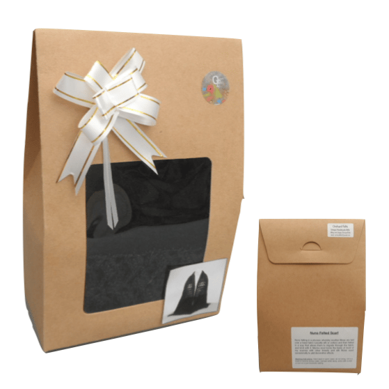 The scarf is a dress length scarf and measures approximately 150cm (59") x 42cm (16.5") and is supplied packaged in a decorated kraft card gift box as shown.