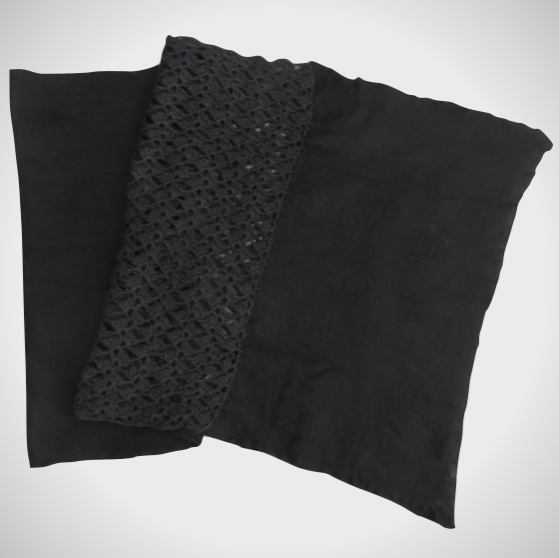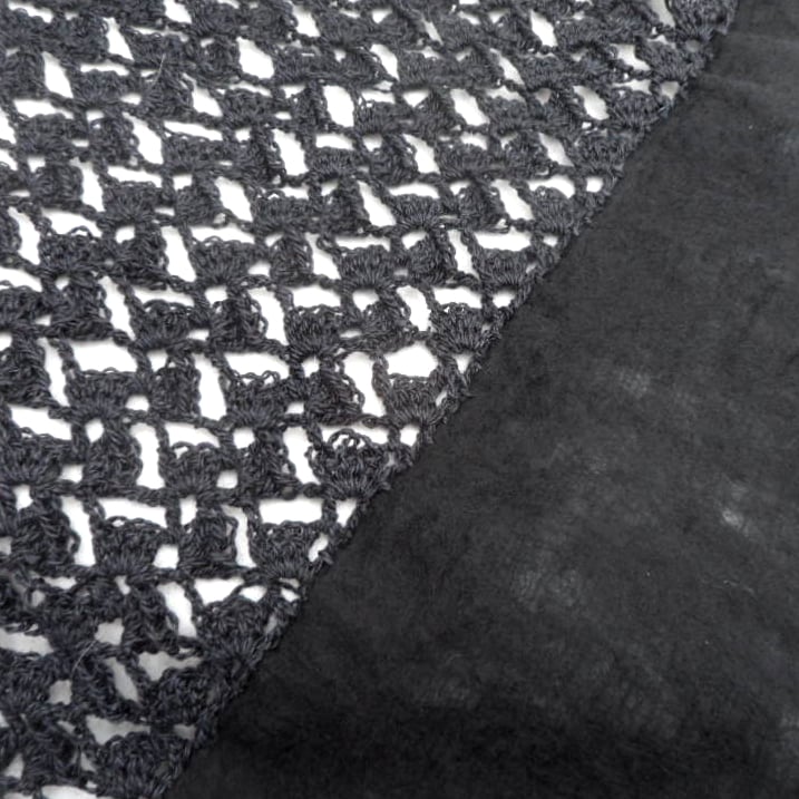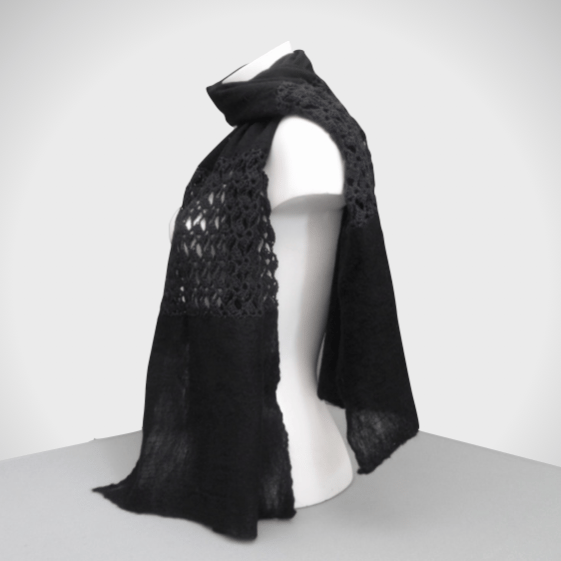 A delightful black nuno felted scarf with crocheted panels.