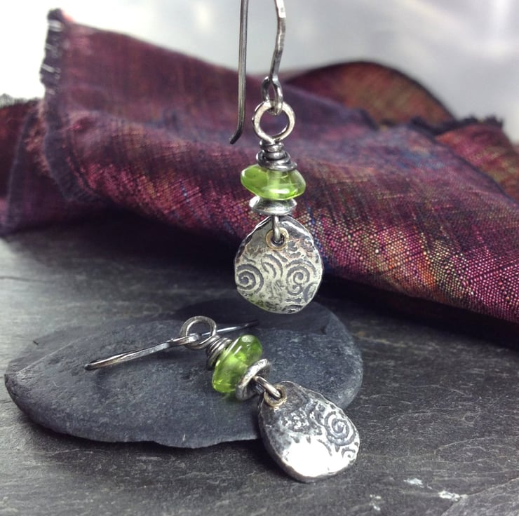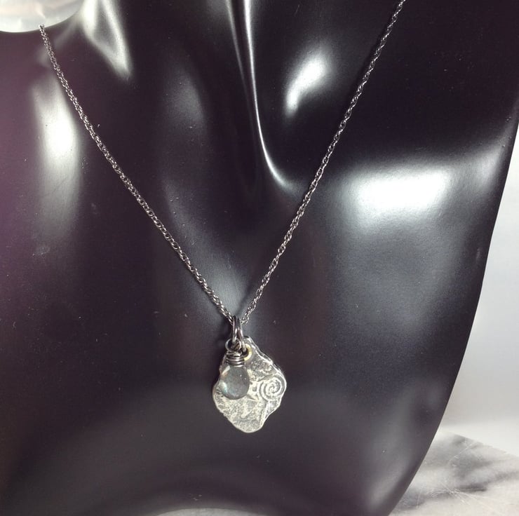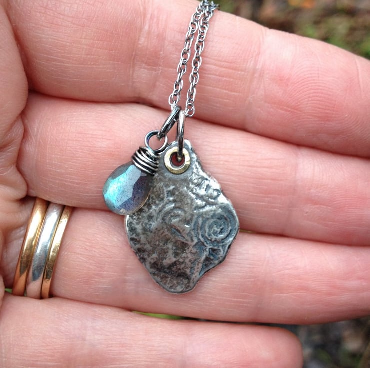 This neclace has a freeform silver focal pendant . Beaten, textured and patterened to give the impression that it is a precious fragment of some ancient timeworn artifact.