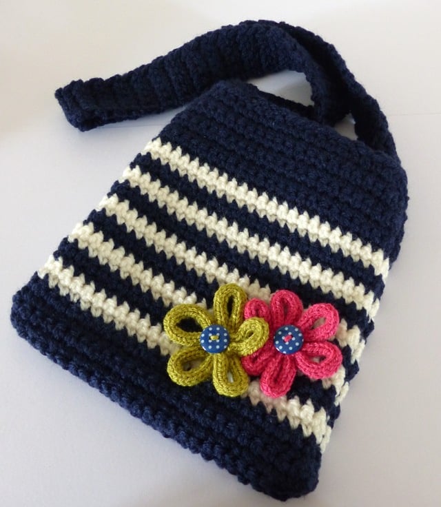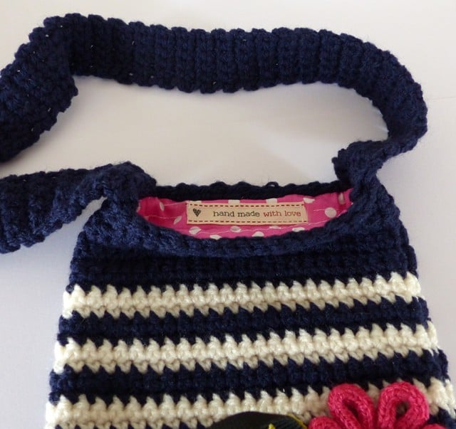 A crocheted bag in navy and cream chunky yarn and decorated with bright pink and green knitted flowers with spotty buttons. The bag measures approximately 9" long x 8" wide and is lined with a pink and white polycotton spotty fabric. The strap measures about 30" so should be long enough to wear across the body.