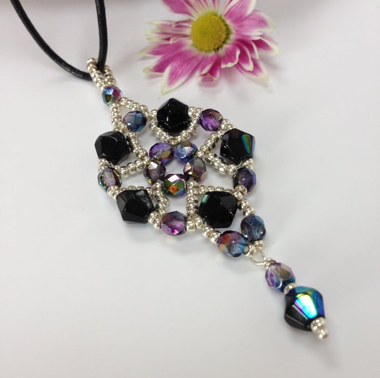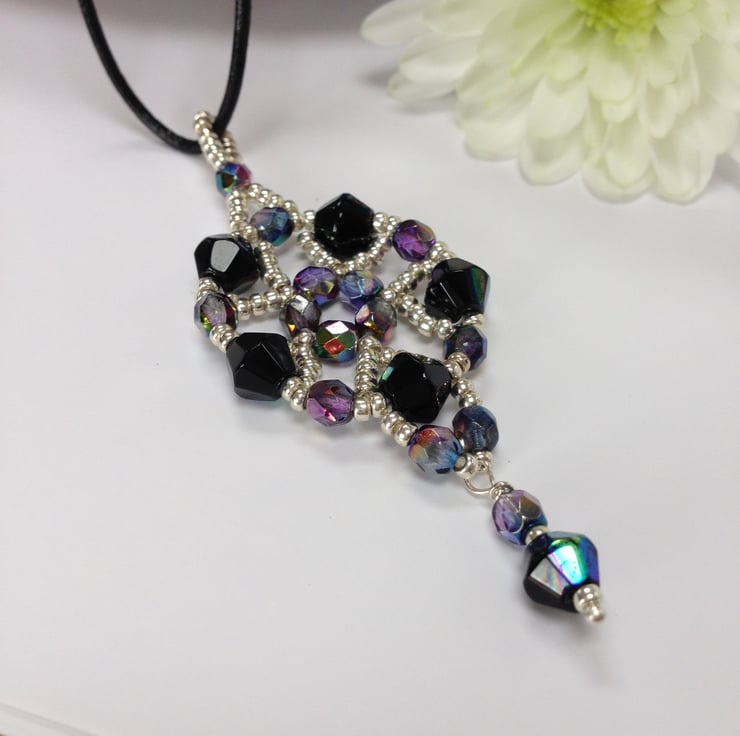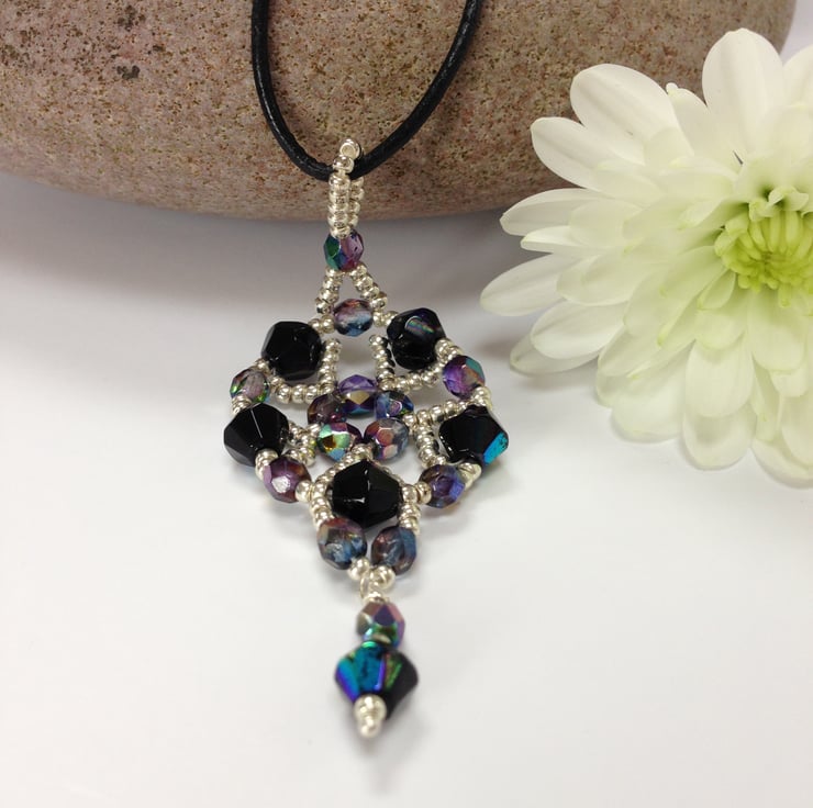 This delicate necklace has been made with iridescent Czech crystal magic fire polished beads interspersed with tiny silver seed beads. It is mounted on a leather cord and finished with a sterling silver bolt ring clasp.