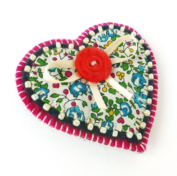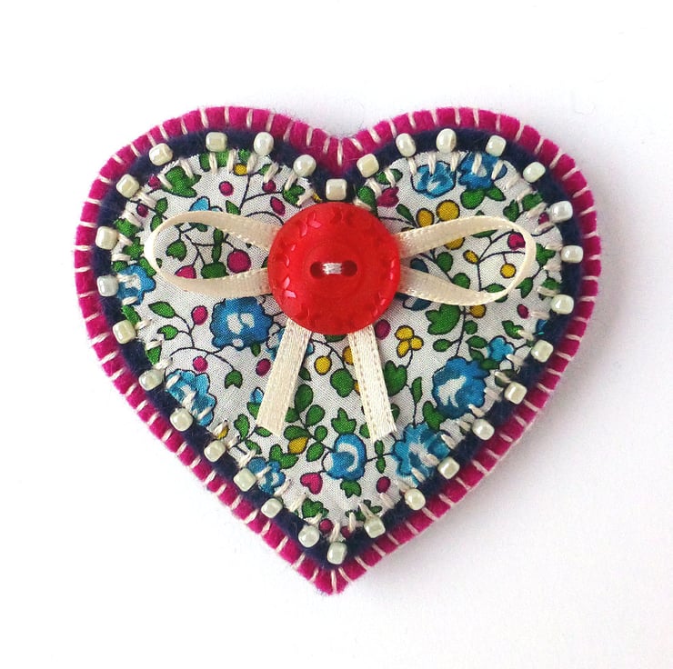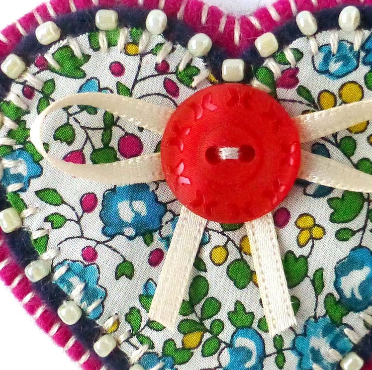 The brooch features an applique heart in Liberty of London cotton print fabric. The fabric has a pretty floral design in shades of pink, turquoise, yellow and green on a white background. This has been hand stitched onto navy blue felt which has been edged with cream seed beads. It has been further mounted onto fuchsia pink felt and is finished with a pretty button and ribbon detail.