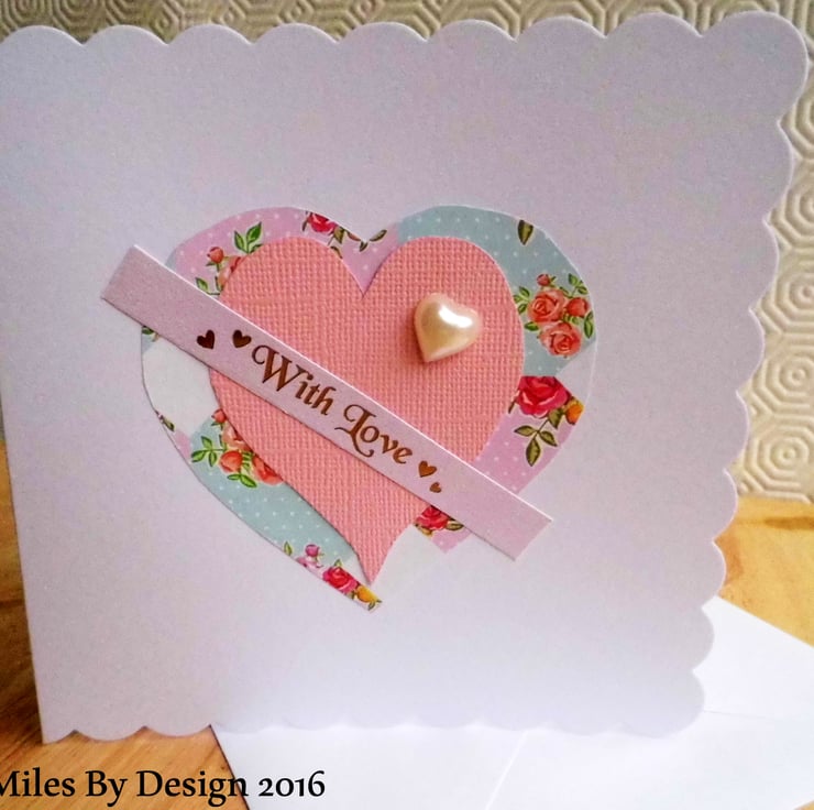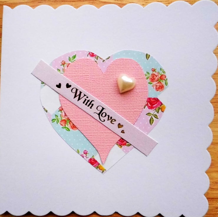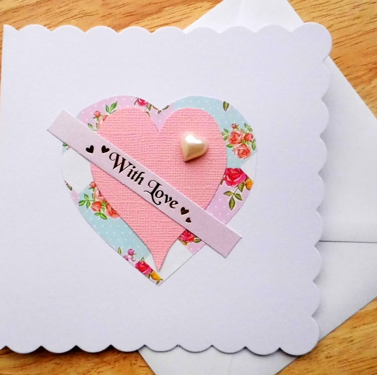It has a pearl heart embellishment and across the centre the pink card banner reads in gold, "With Love ".