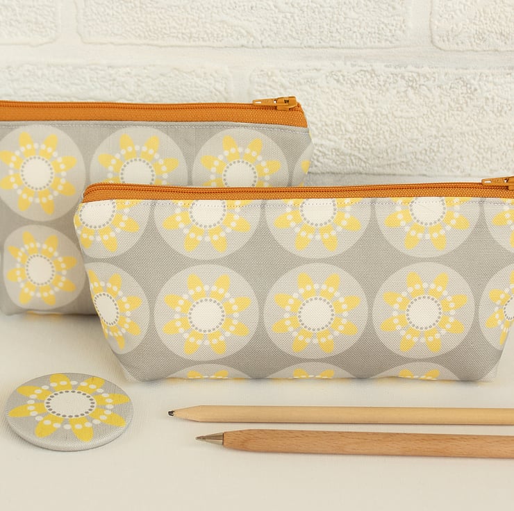 Lined in grey dotty ring cotton and finished with a mustard yellow zip. There is also a layer of squishy interlining between the two visible layers, this helps keep the shape and adds a layer of protection for the contents.