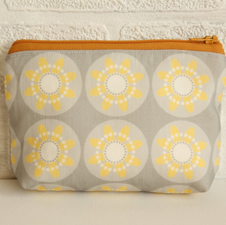 A zipped purse made using my own fabric design in Yellow and Grey.