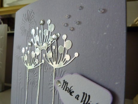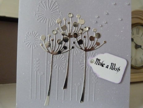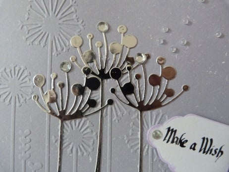 A completely handmade and uniquely designed card. Consisting of pale grey and white flecked card which has dandelion heads embossed. Three further dandelions die cut from silver mirri card which have been embellished with large clear rhinestones. Clear glass beads added to emulate the flower heads flying off in the breeze. Finished off with a Make a Wish tag.