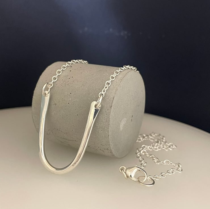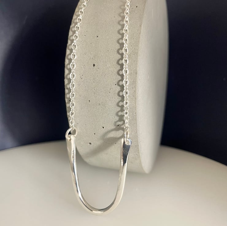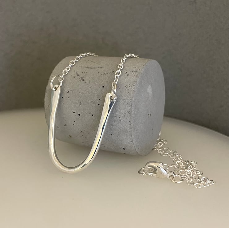 A lovely lucky horse shoe necklace handmade from 925 sterling silver. Cut by hand from solid 2.5mm thick silver round wire, hand forged into a U shape then hammered to create it’s unique textured surface. Through drilled holes on either side silver trace chain is added onto silver jump rings along with a silver trigger clasp as it's fastening.