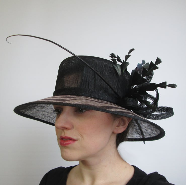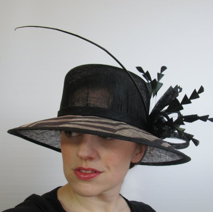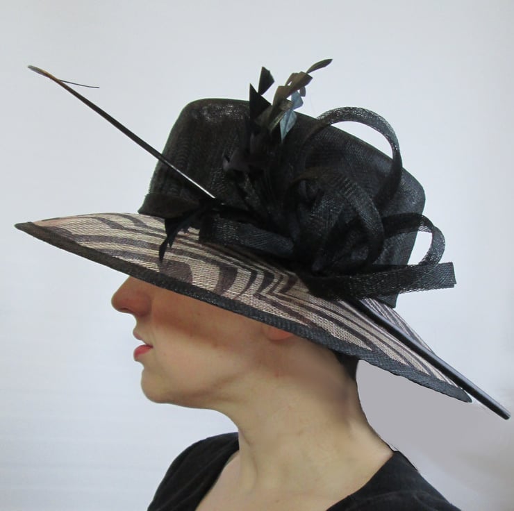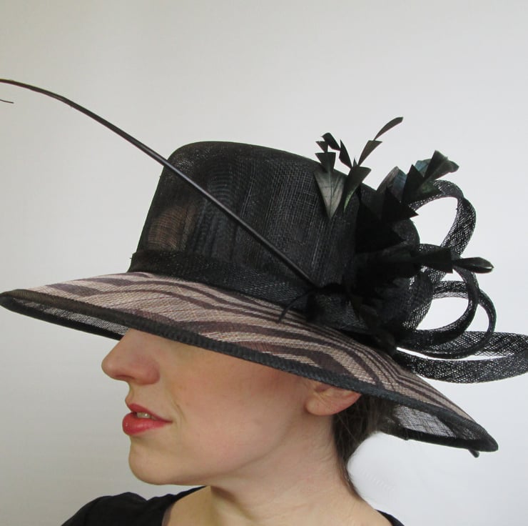 Striking black occasion hat with zebra print brim. The hat has been handmade using traditional millinery methods and finished by hand with sinamay swirls and feathers.
