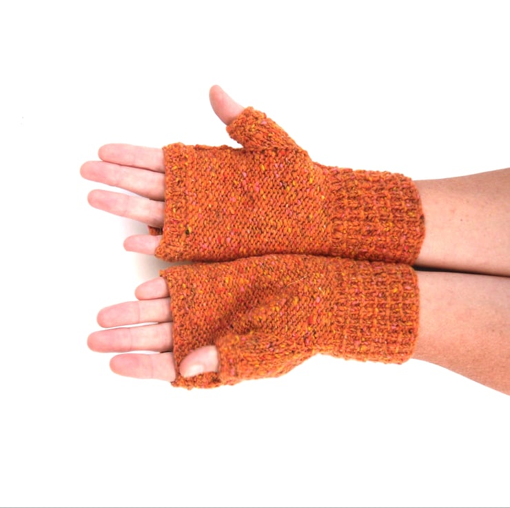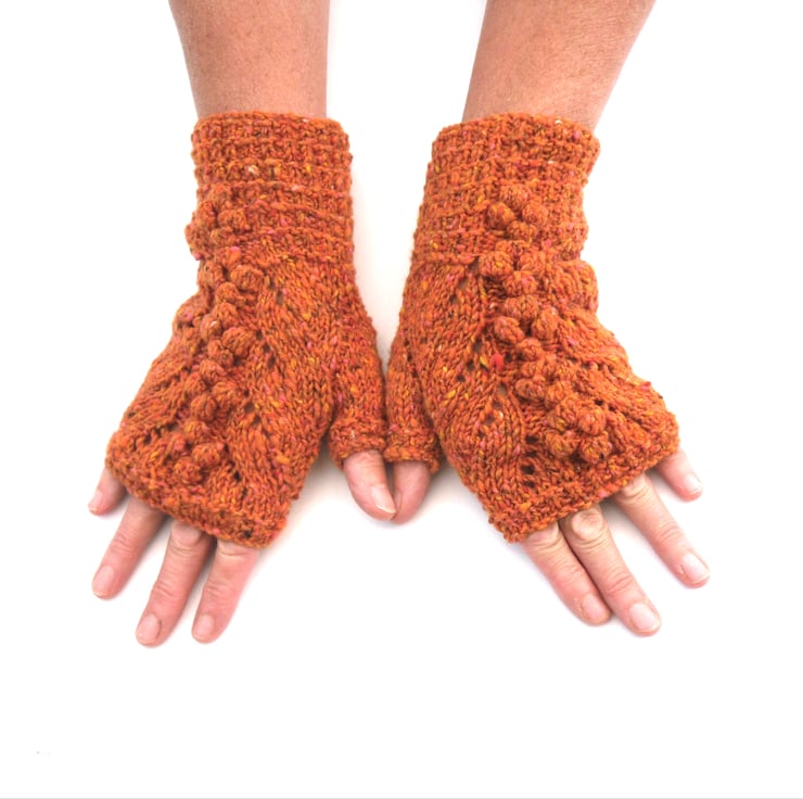 Pure 100% wool mitts , hand knitted fingerless gloves in Rowan's tweedy yarn. Knit to my own design incorporating both lace work and bobbles going up the centre of each glove. Pretty fashionable gloves.