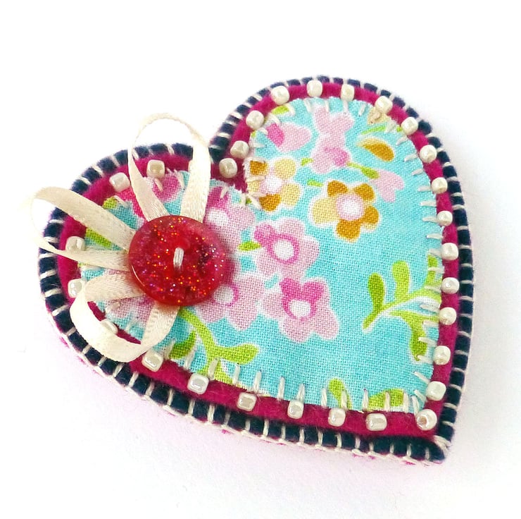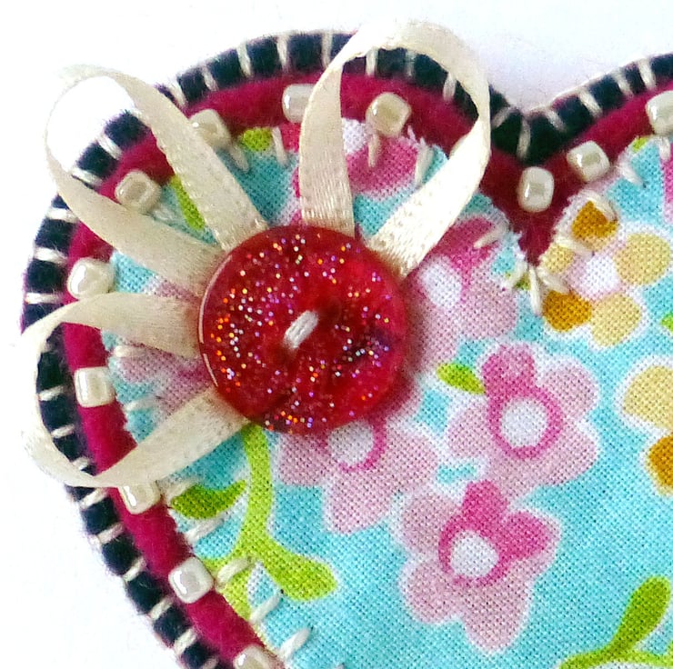The brooch is hand sewn and features an appliqued heart in cotton fabric in turquoise flower print. This has been sewn onto fuchsia pink felt which has been edged with cream seed beads. It has been further mounted onto navy felt and finished with a little sparkly pink button and ribbon detail.