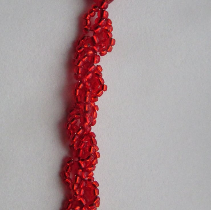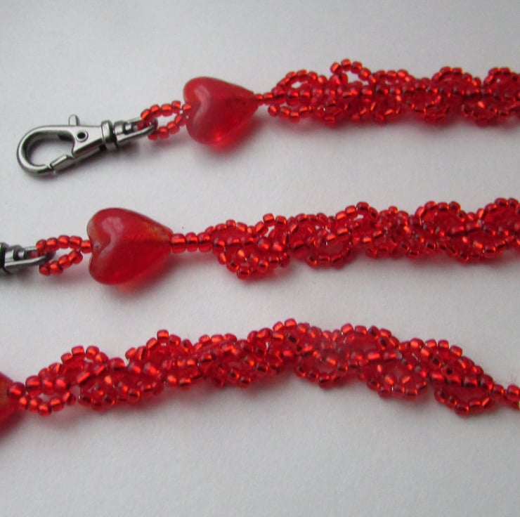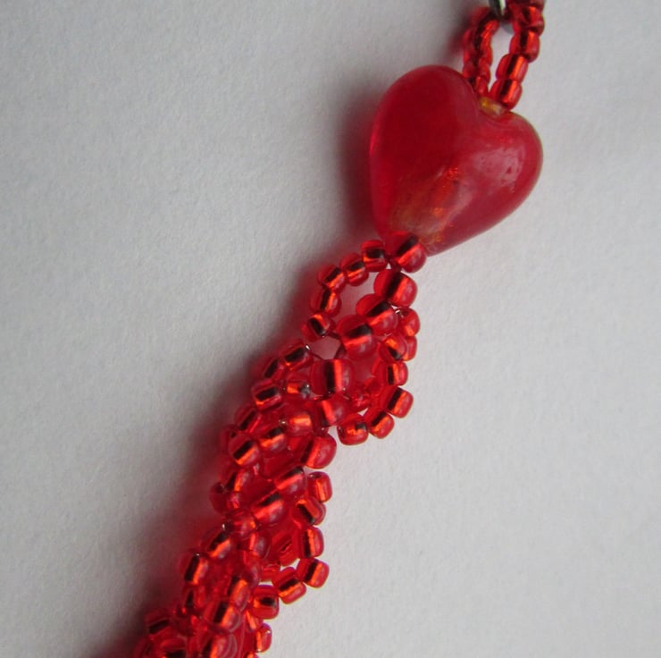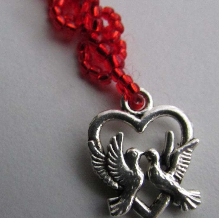 Bag charm made with red size 11 glass lined seed beads, a red foil lined glass heart bead at the top and a Tibetan silver dove and heart charm at the bottom, finished with a swivel clasp for easy fitting on to a handbag, the bag charm measures 11cm from the base of the swivel clasp.