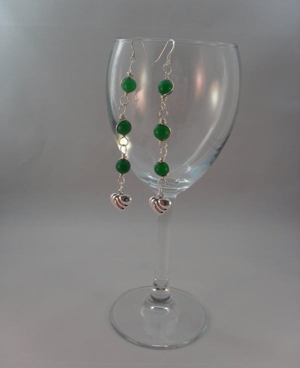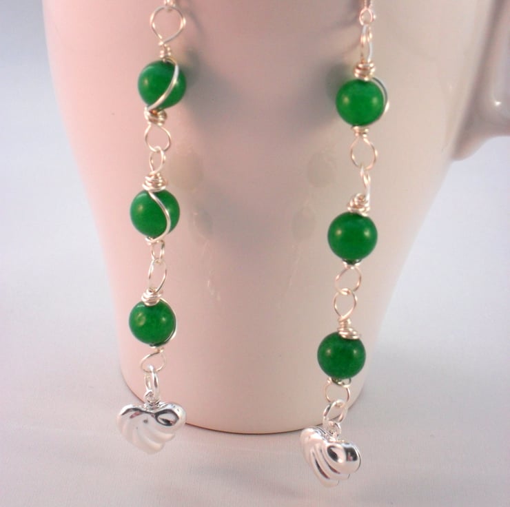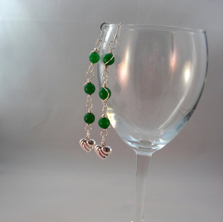 Green quartzite semi precious gemstones have been wire wrapped with silver coloured wire with silver plated heart charms they have then been attached to sterling silver ear wires.