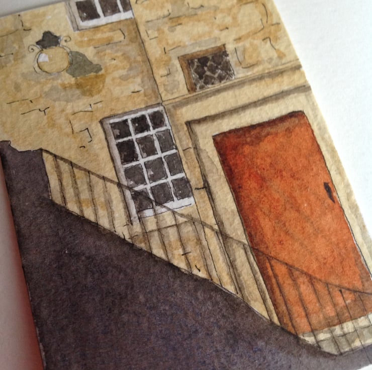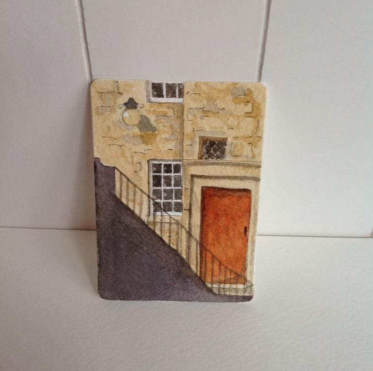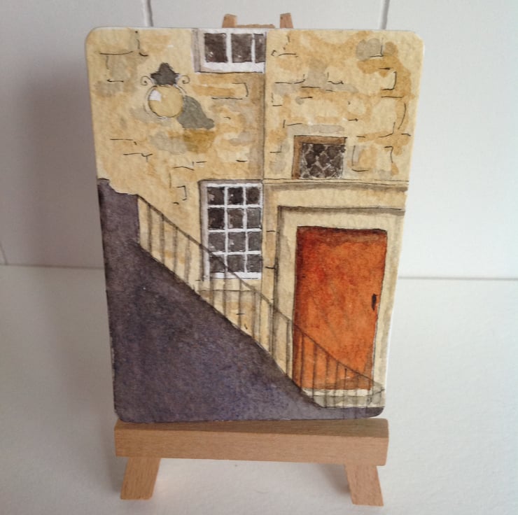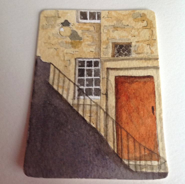 An unusual view of a glimpse behind the Royal Mile in Edinburgh captured in an ACEO watercolour painting.