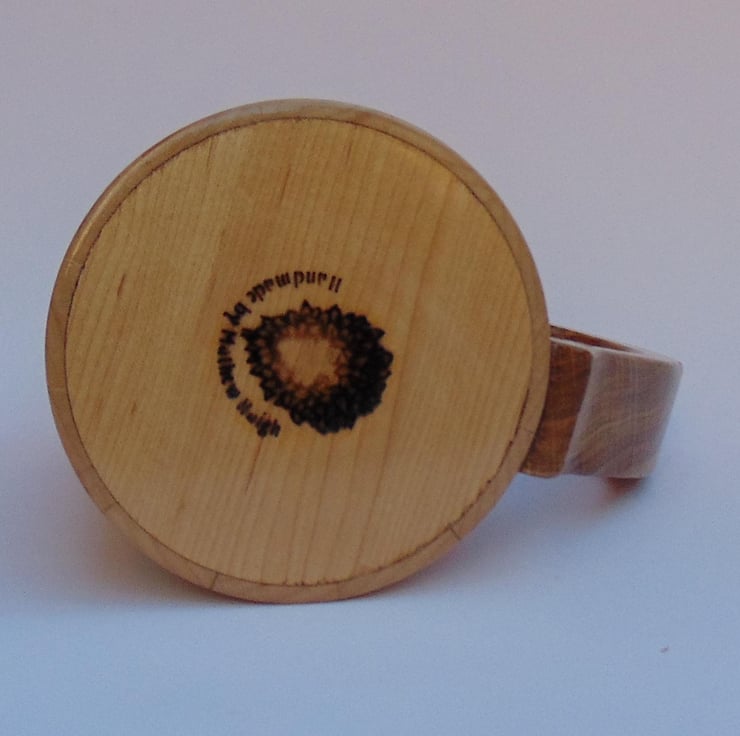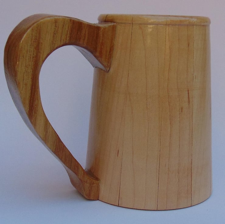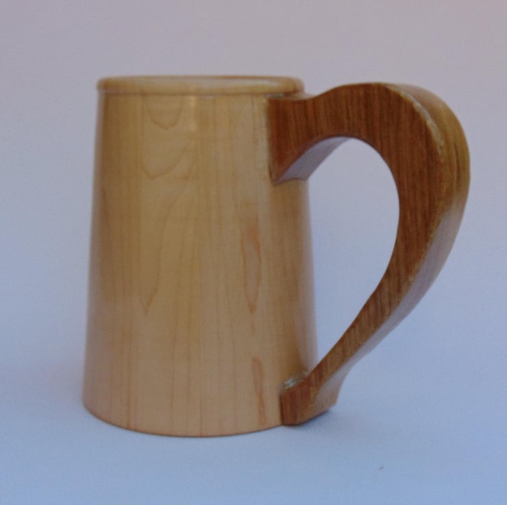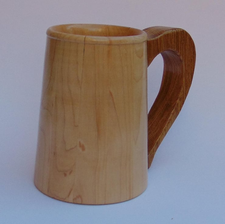This drinking vessel has been turned from Cherry. The sides of the vessel have been made from twelve individual staves of cherry glued together, similar to how wooden barrels are coopered. The staves are then attached to a solid base and the vessel turned on a lathe. The handle has been shaped from Oak.