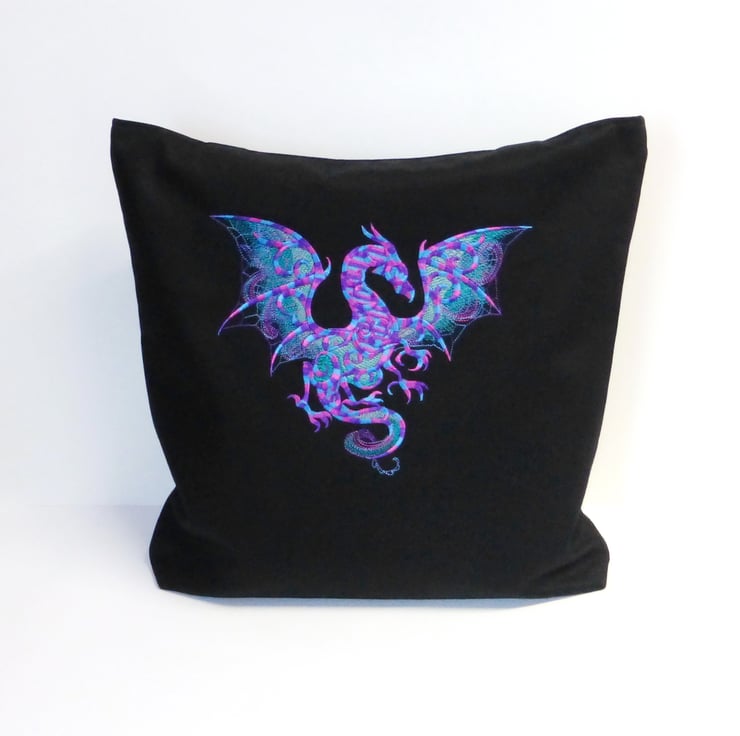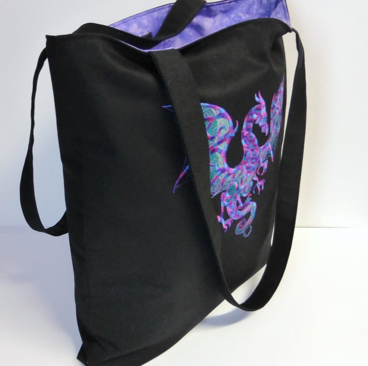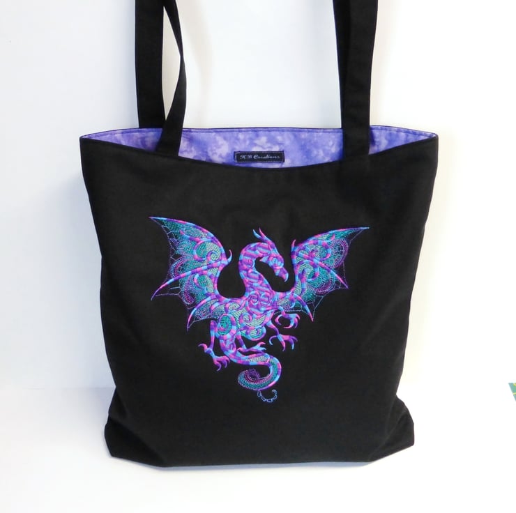A medium sized tote bag made of black cotton drill fabric, embroidered with a stunning dragon in shades of purple, teal and pink.