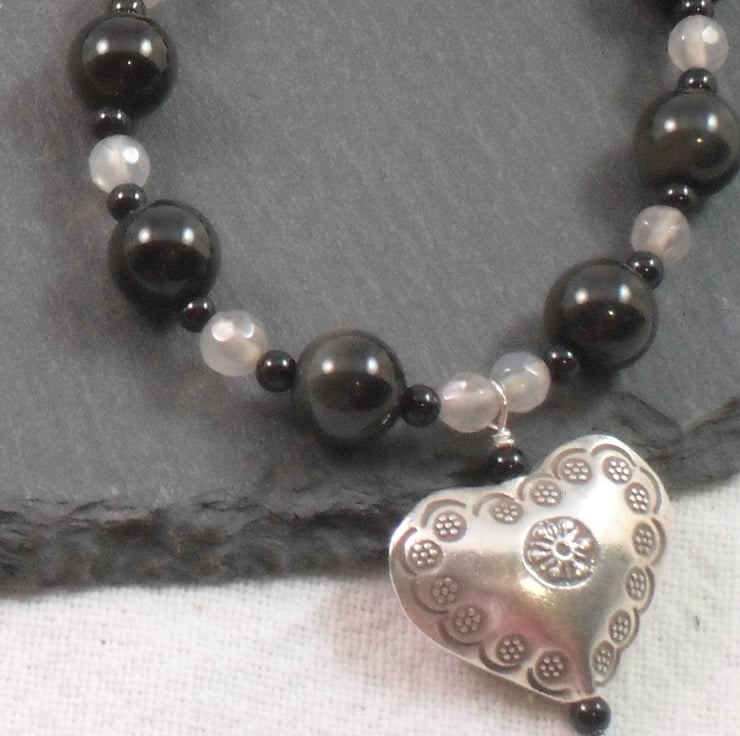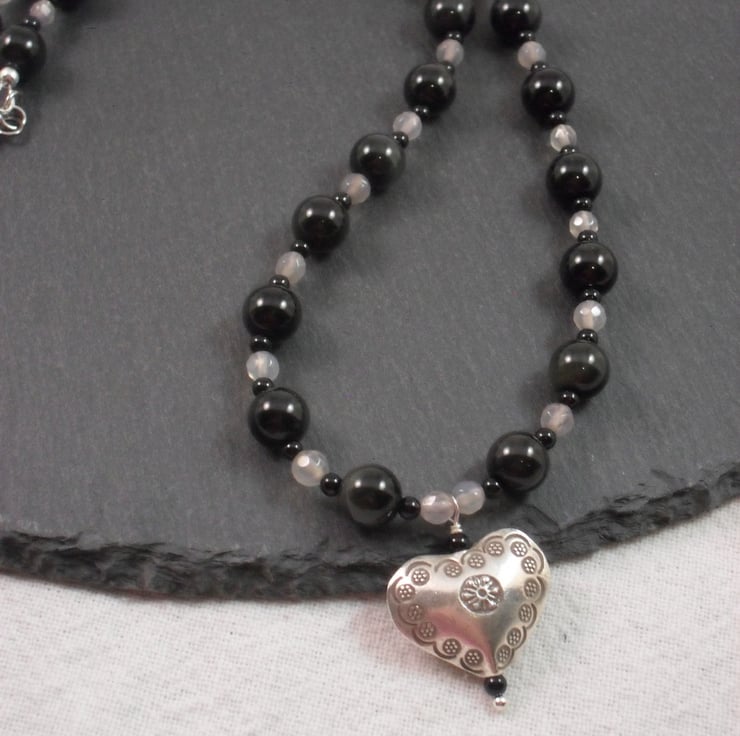 Obsidian which is black in colour , you get a light golden glow as the stone moves, agate beads in a light grey and black. In the centre of the necklace there is a hill tribe heart bead which is 99% pure silver .