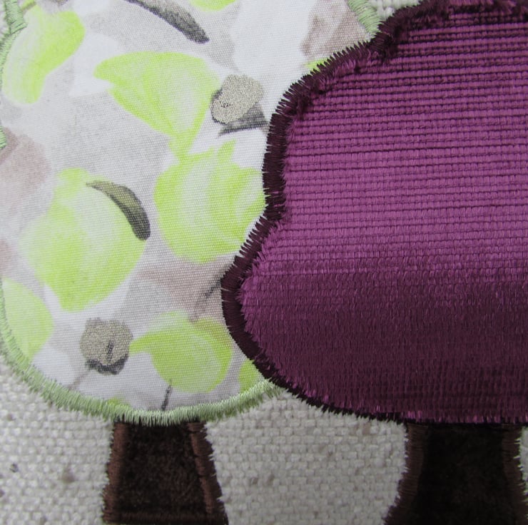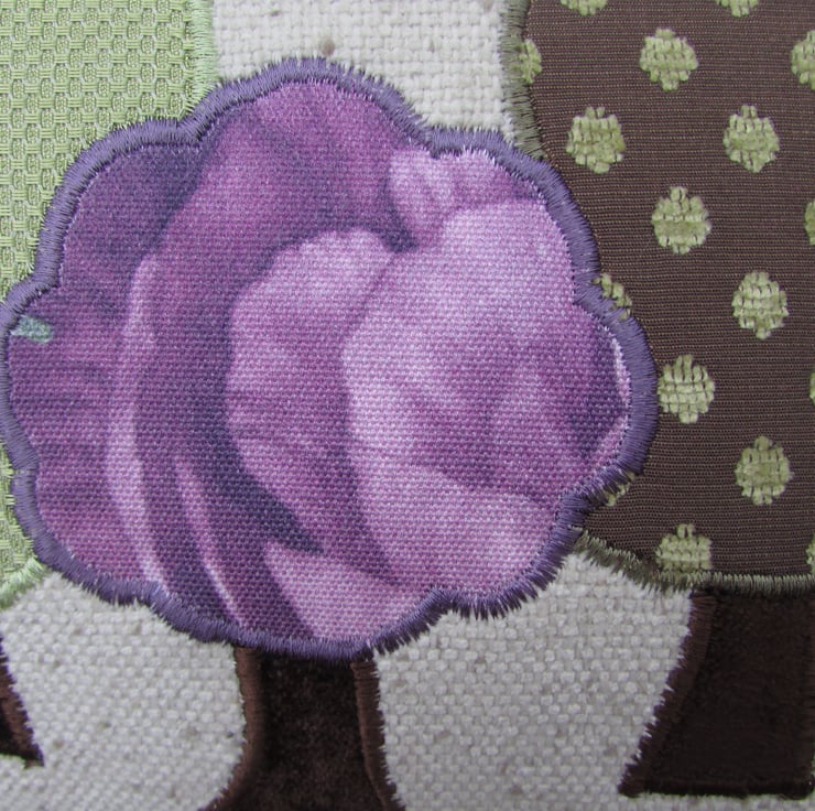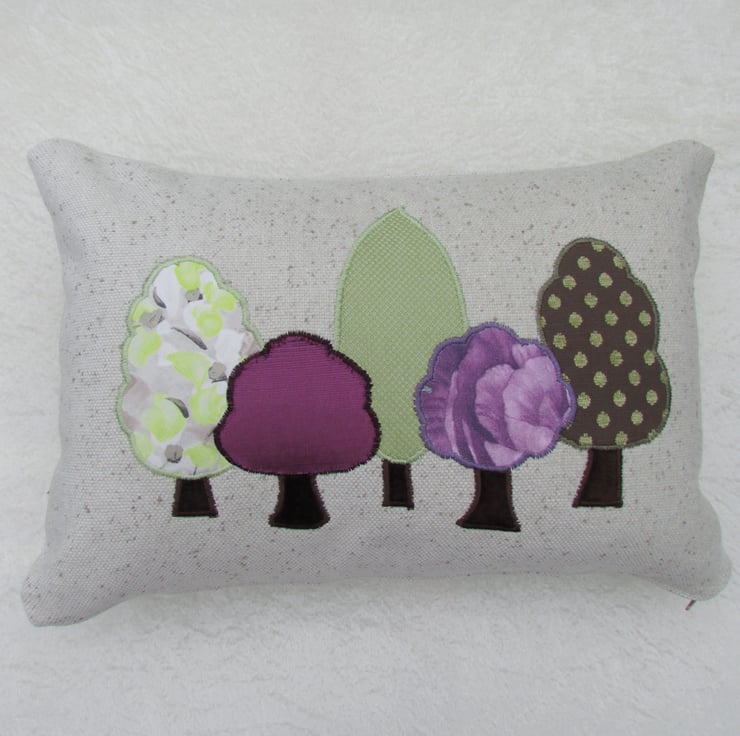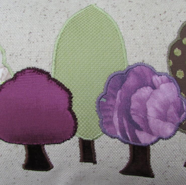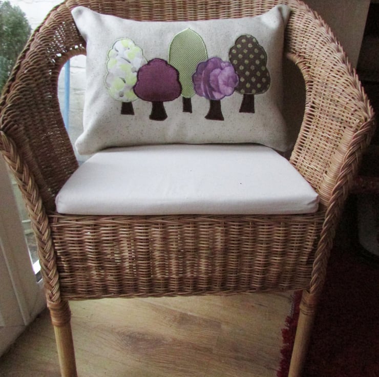 A rectangular cushion in a delightfully rustic looking cream thick woven fabric flecked with beige. The cushion is appliqued with five trees in Spring colours. The fabrics have a variety of patterns and textures and consist of shades of purple, plum, pale green, yellow and brown. The tree trunks are made from brown velvet.