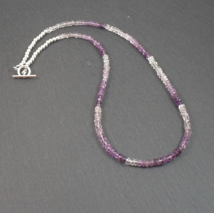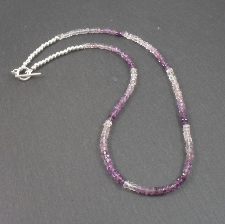 Shaded amethyst gemstones have been beaded onto 19 strand good quality beading wire with sterling silver 3 mm beads and a small sterling silver toggle clasp and wire protectors